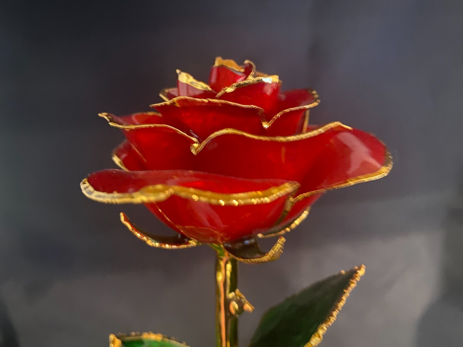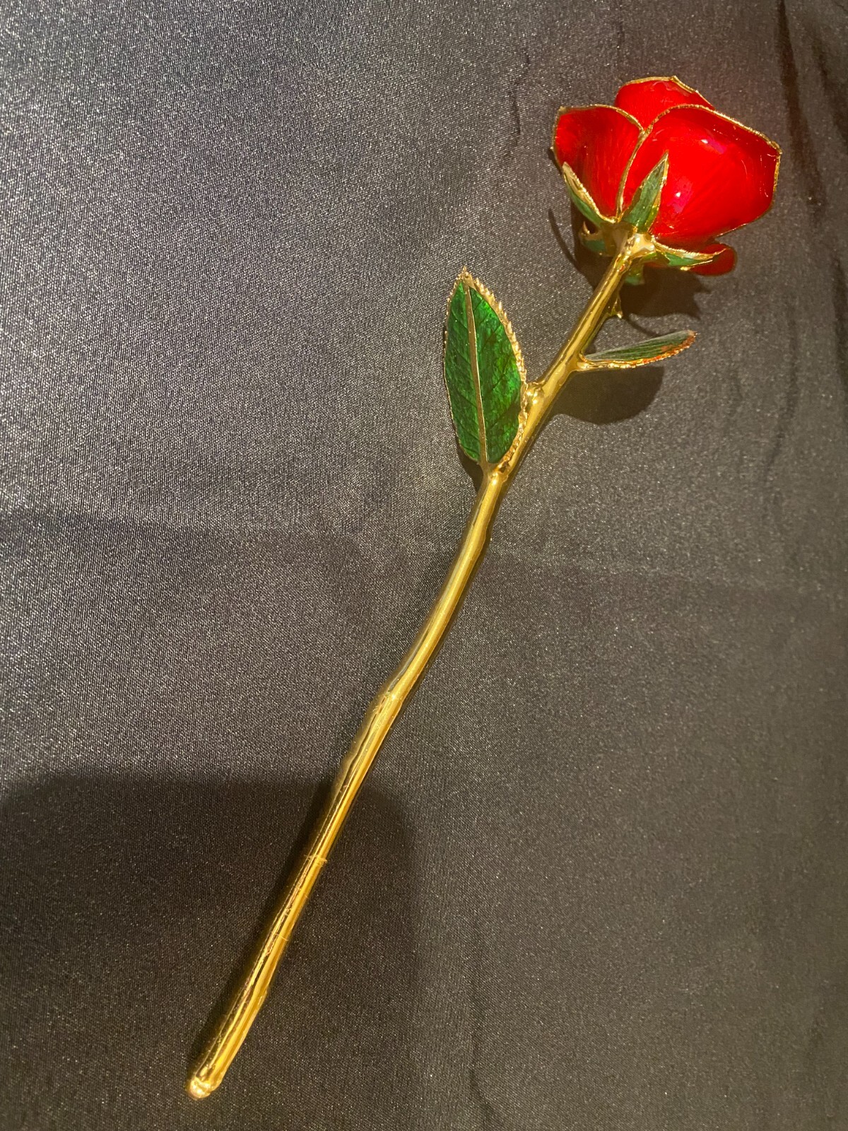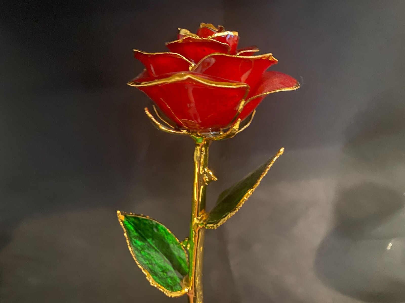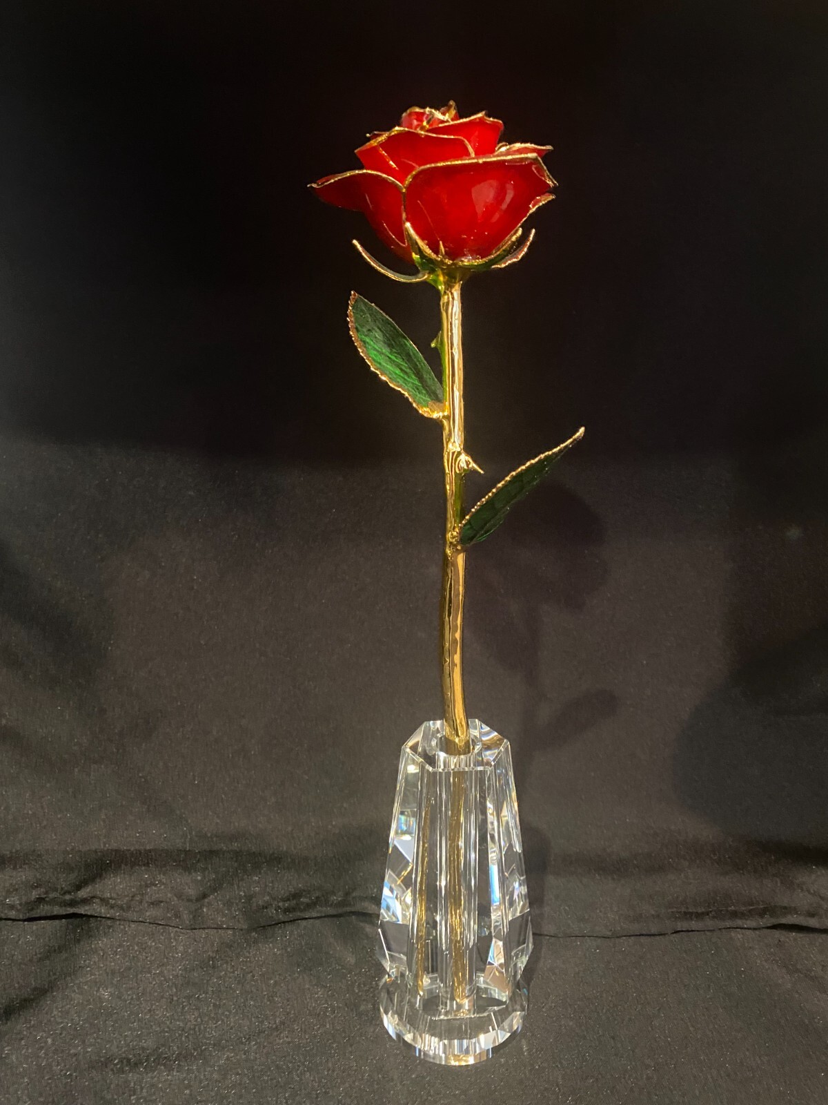 Give your love Valentine's Day roses that will last forever! Bouquets of roses are lovely but soon start to wilt and before long are simply thrown in the trash. This beautiful flower is a real fresh cut rose preserved in 24K Gold and resin to last forever. The natural details of the rose bud, leaves, thorns and stem are wonderfully preserved. Includes a Crystal Vase to proudly and securely display this unique and treasured gift. Looks incredible in any room with its gleaming gold stem and gold accented rosebud and leaves. Your special someone will remember your love always. Add a second Rose or more to create your own bouquet.