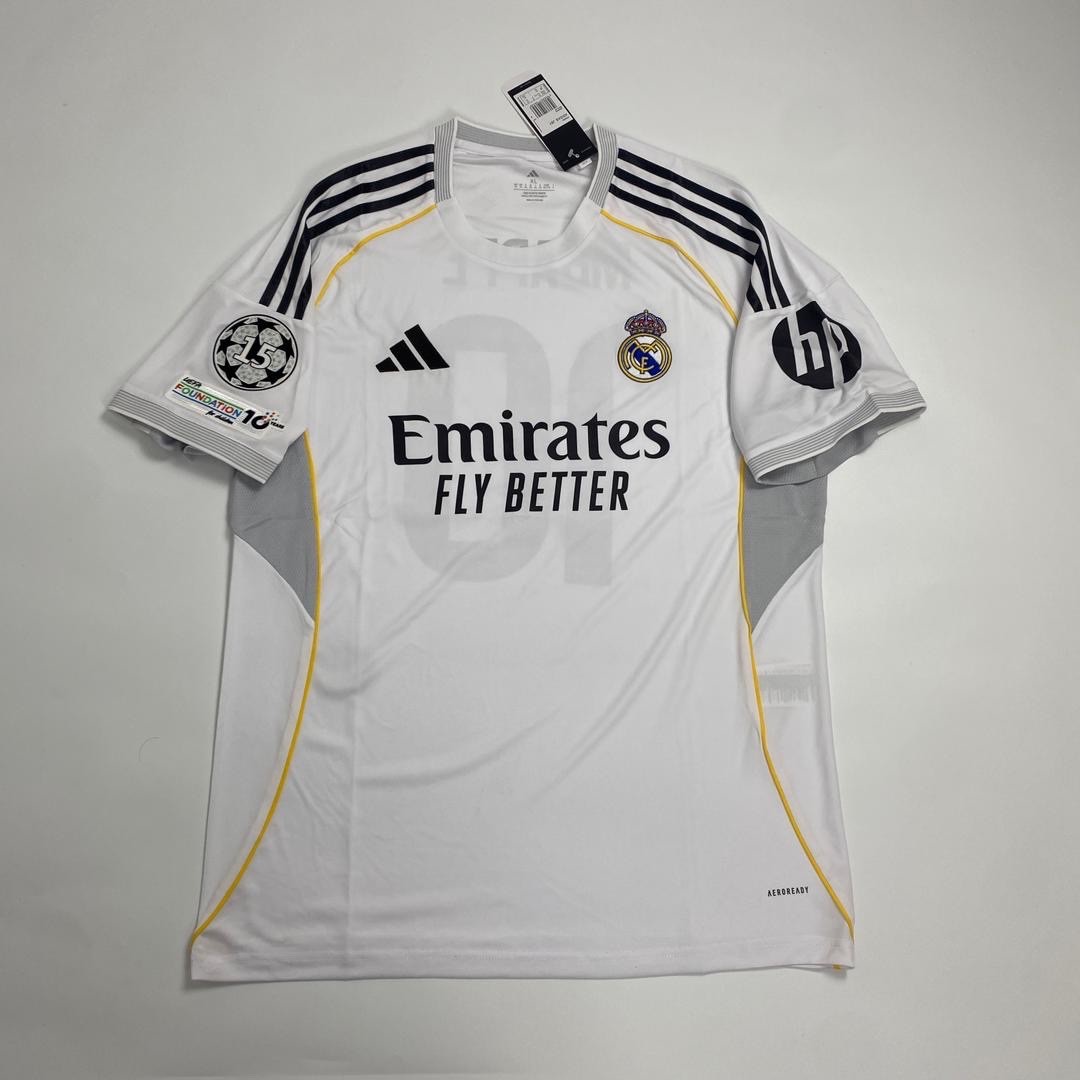 The product is a Real Madrid 25/26 Home Mbappe #10 jersey. It is a white soccer jersey featuring Mbappe's iconic number 10. This jersey is a must-have for fans of Real Madrid and soccer enthusiasts alike. Made with quality materials, this jersey is perfect for showing support for your favorite team and player on match days or during casual wear. The size ranges from small to extra-large, ensuring a comfortable fit for all fans.