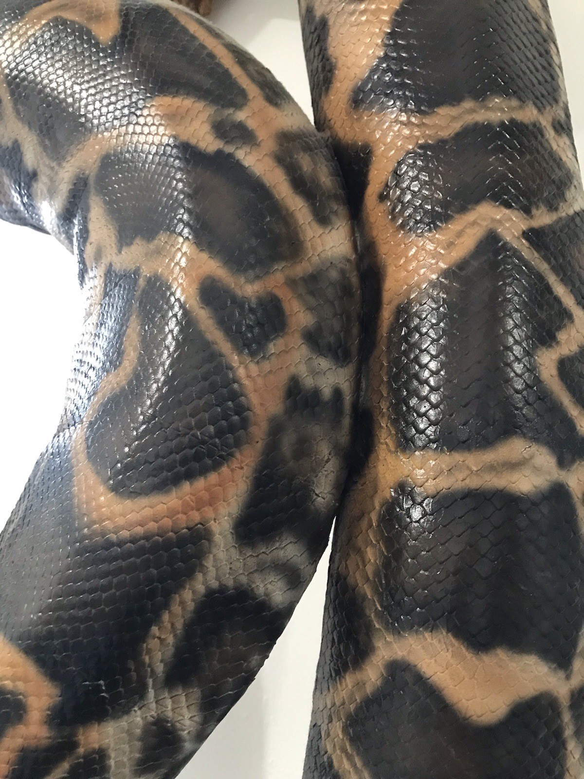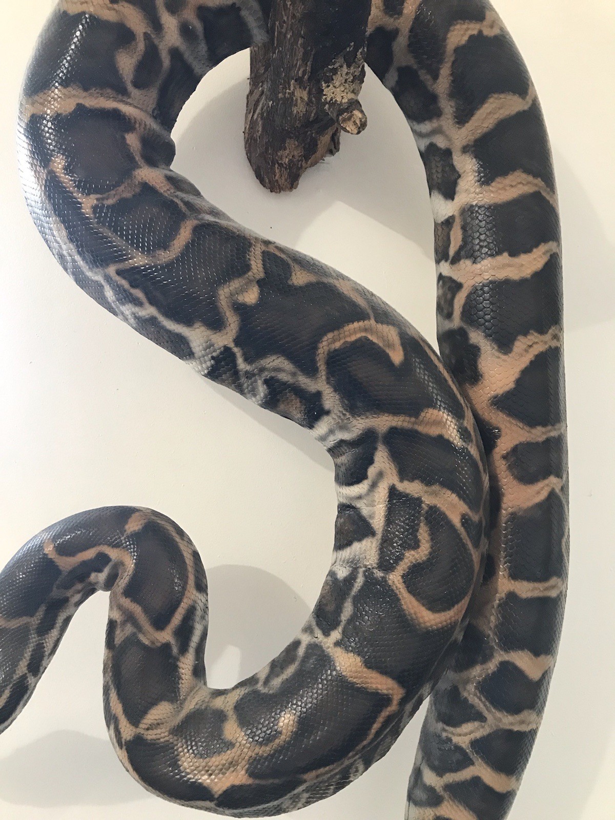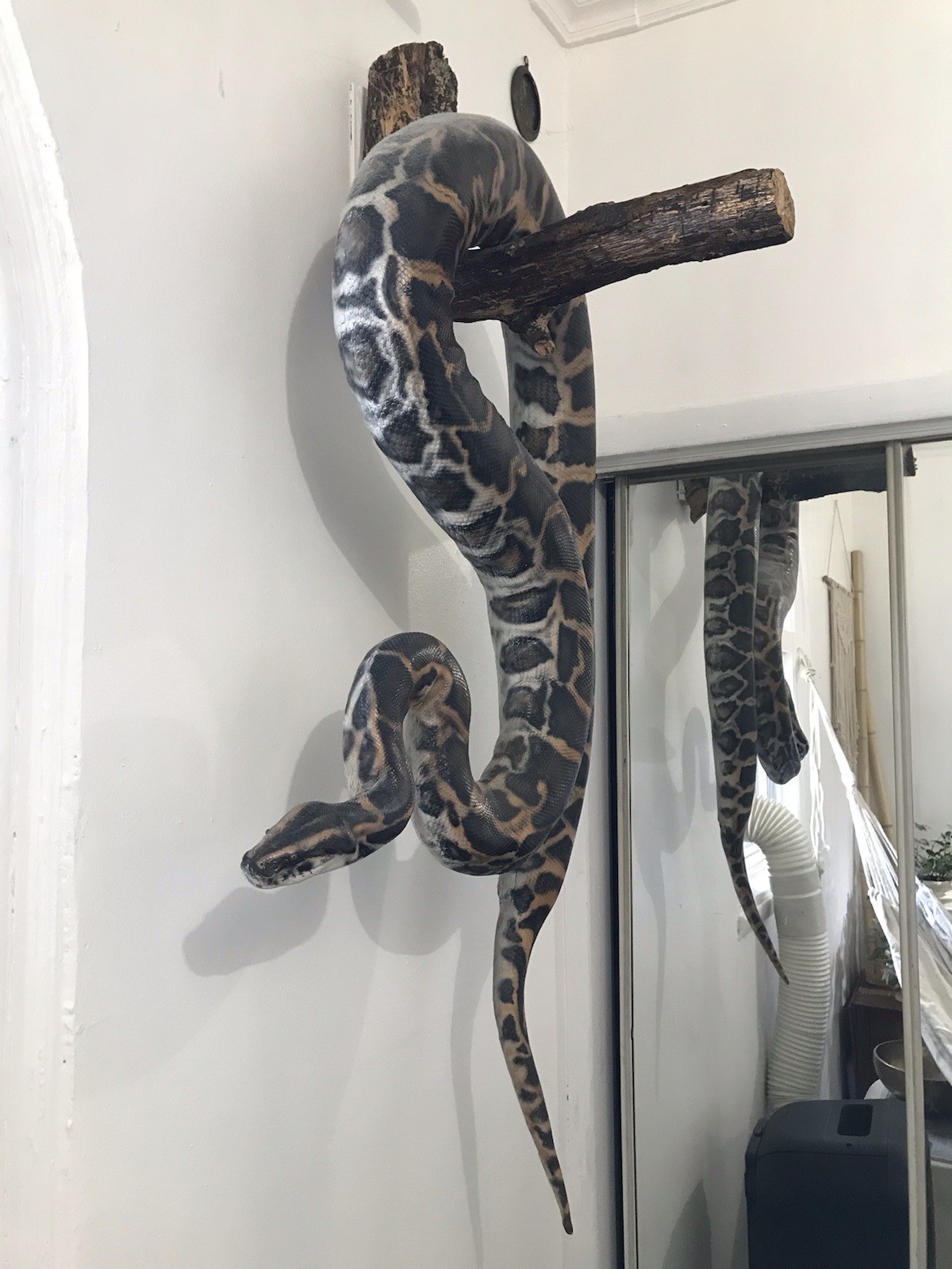 Contact before buying please! Gorgeous, unique, very real like sculpture of an Burmese Python 4’x2’ diameter. Life size sculpture, the snake is about 9’ long, head to tail . Fiberglass made in mold technique Snake and real wood trunk support base. This sculpture was a decor for a reptilian museum.