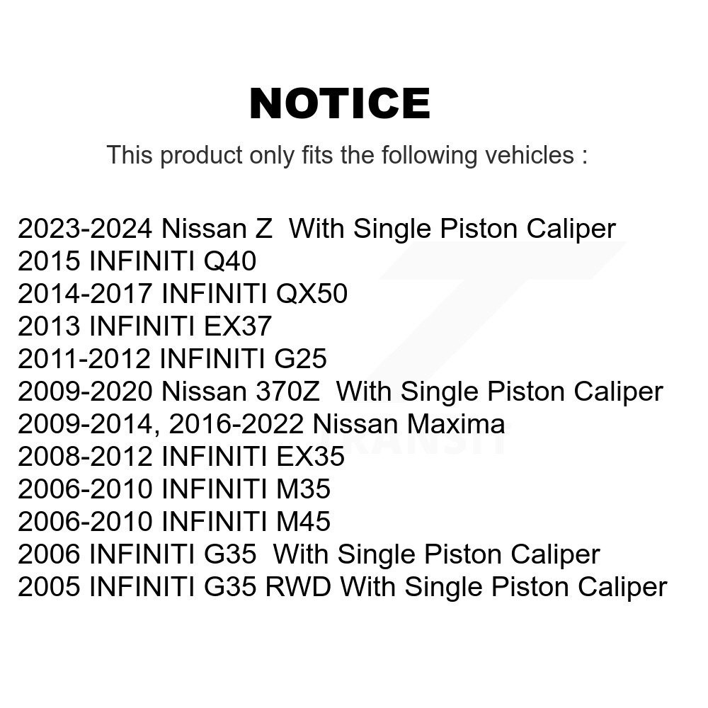 Transit Auto Rear Coated Drilled Slotted Disc Brake Rotors And Semi-Metallic Pads Kit KDF-100481 📦 Included 📦 2x Rear Coated Disc Brake Rotor (Both Side) 1x Rear Semi-Metallic Brake Pad Set (Hardware Included) Transit Auto offers the most comprehensive and highest-quality replacement kits on the market. Thanks to our cutting-edge AI, in-house product team, and proprietary fitment data, we are able to build and deliver the most accurate kits on the market. All our kits include the highest-quality parts on the market, sourced directly by Transit and its sub-brands. Backed by over 50 years of experience and with in-house quality assurance, every customer can purchase and drive with peace of mind. Transit Auto is the largest kit supplier, with over 100,000 kits, and the only supplier to provide the true picture of the kits and the complete buyer's guide. Whether you are a Do-It-Yourself enthusiast, a Mechanic, or a Garage, we have the right kit for you. ⚙️ Features ⚙️ Exclusive PowerGrip™ Semi-Metallic formula provides unmatched braking power (powerful friction, extreme temperature tolerance, aggressive initial bite) while maintaining low dust and noise Engineered with Carbon-Enhanced PowerCast™ (G11H18/G3000) iron castings to achieve an unmatched power and braking performance (strength, grip, stability) Fiber-Reinforced Multi-Layer Shim with a rubber core minimize noise, vibration, and harshness for complete quietness Exclusive DS1™ Bi-Directional Drilled and Slotted for universal left or right installation Engineered with High Carbon SteelRX™ alloy (Pressure Resistant, Thermal Conductive) and dipped in an Anti-Rust Black Paint to improve durability Precision Cross-Drilled and Slotted for maximum cooling and heat dissipation Scorched for almost no break-in process required, raised initial cold effectiveness, and enhanced Pad-to-Rotor contact Kit Includes: 2x Rear Coated DS-One Disc Brake Rotor (Both Side) + 1x Rear Semi-Metallic Positive Plus Brake Pad Set (Hardware Included) Kit Variations: K8C-101773 K8F-101796 K8S-101822 K8T-101925 KDC-100812 KDS-100441 KDT-100498 KGC-101488 KGF-101410 KGS-101350 KGT-101508 Part Reference Numbers : AC31387 AC31530 AG31387 AG31530 CR31387 CR31530 PR31387 PR31530 31387 31530 2164626 YH200489C YH248689C YH200489P YH248689P YH200489 YH248689 120.42088 BR31387 BR900714 NI-4026 NI-497 2031387 248880333 248880710 348880333 348880710 748880333 748880710 900714 126471 980333FZN 980333R 980710FZN 980710R 980333 980710 B31387 B31530 1393A 905A D1393A D905A 8405 8501 7784 SG7784X PF7784X AD7784 QE7784X SS7784X UP7784X D905 905 ⚠️ This product will only fit on the following vehicles ⚠️ 2023-2024 Nissan Z With Single Piston Caliper 2015 INFINITI Q40 2014-2017 INFINITI QX50 2013 INFINITI EX37 2011-2012 INFINITI G25 2009-2020 Nissan 370Z With Single Piston Caliper 2009-2014, 2016-2022 Nissan Maxima 2009-2013 INFINITI G37 Sedan Without Brembo Brakes 2008-2012 INFINITI EX35 2006-2010 INFINITI M35 2006-2010 INFINITI M45 2006 INFINITI G35 With Single Piston Caliper 2005 INFINITI G35 RWD With Single Piston Caliper 📃 Interchanges numbers 📃 AC31387 AC31530 AG31387 AG31530 CR31387 CR31530 PR31387 PR31530 31387 31530 2164626 YH200489C YH248689C YH200489P YH248689P YH200489 YH248689 120.42088 BR31387 BR900714 NI-4026 NI-497 2031387 248880333 248880710 348880333 348880710 748880333 748880710 900714 126471 980333FZN 980333R 980710FZN 980710R 980333 980710 B31387 B31530 1393A 905A D1393A D905A 8405 8501 7784 SG7784X PF7784X AD7784 QE7784X SS7784X UP7784X D905 905 🔄 Kit Variations 🔄 K8C-101773, K8F-101796, K8S-101822, K8T-101925, KDC-100812, KDS-100441, KDT-100498, KGC-101488, KGF-101410, KGS-101350, KGT-101508 🛡️ Warranty 🛡️ This product is covered by a limited lifetime warranty against manufacturer defects. See manufacturer website for details and form. Keywords & 2005 2006 2007 2008 2009 2010 2011 2012 2013 2014 2015 2016 2017 2018 2019 2020 2021 2022 2023 2024 370Z abutment And Both Brake Coat Coated Coating Conversion Disc Drill Drilled Driver DS1 e-coat e-coating EX35 EX37 Full G25 G35 G37 hardware INFINITI Kit Kits Left M35 M45 Maxima metallic n Nissan Package Passenger Performance Pkg PPF Q40 QX50 Racing Rear Right RWD Sedan semi semi-metallic Set Sides Slot Slotted Upgrade Summit With Z Zinc