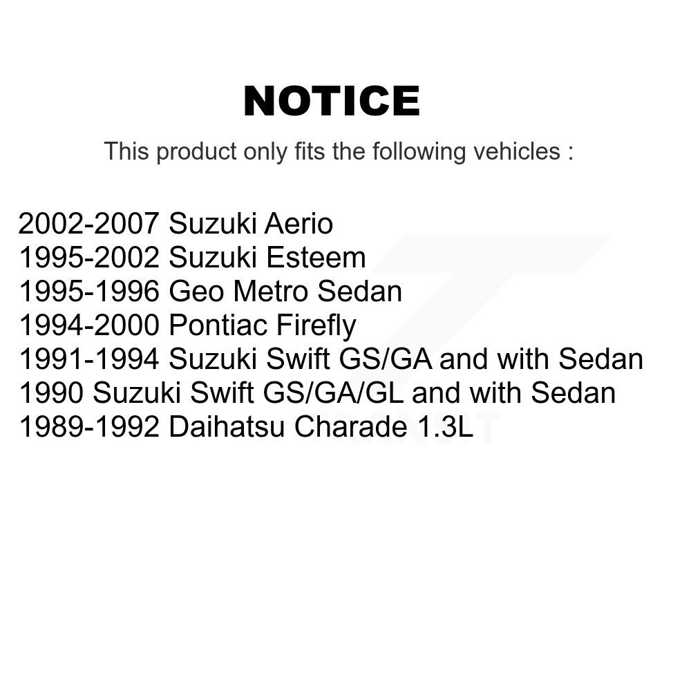 Rear Drum Brake Shoes NB-630B-1688-30 📦 Included 📦 1x Rear Drum Brake Shoe Set The TQ shoes offer the most optimal braking component on the market surpassing any competition for drums on the market. ⚙️ Features ⚙️ Exclusive MetalliX™ Low Resin Semi-Metallic compound provides unmatched braking performance (abrasive friction, high temperature tolerance, quicker compound warming) while maintaining low dust and noise Engineered with High Carbon SteelRX™ alloy (Pressure Resistant, Thermal Conductive) and dipped in an Anti-Rust Black Paint to improve durability One-Piece Integral Molding Technology improves the durability of the shoes and extends the service life True Arc-Ground grinded for perfect friction-to-drum contact and increased torque Laser validated for perfect fit, resulting in smooth brake operation and noise reduction Bonded or Riveted per OE specifications Attached levers and pins included to match OE (on specific applications) Part Reference Numbers : 630 NB630 111.06300 630PG 630B Kit Includes: 1x Rear Drum Brake Shoe Set Part Reference Numbers : 630 NB630 111.06300 630PG 630B ⚠️ This product will only fit on the following vehicles ⚠️ 2002-2007 Suzuki Aerio 1995-2002 Suzuki Esteem 1995-1996 Geo Metro Sedan 1994-2000 Pontiac Firefly 1992-1994 Geo Metro Vehicles Built For Canadian Market 1991-1994 Suzuki Swift GS/GA and with Sedan 1990 Suzuki Swift GS/GA/GL and with Sedan 1989-1992 Daihatsu Charade 1.3L 📃 Interchanges numbers 📃 630 NB630 111.06300 630PG 630B 🛡️ Warranty 🛡️ This product is covered by a limited lifetime warranty against manufacturer defects. See manufacturer website for details and form. Keywords 1.3L 1989 1990 1991 1992 1993 1994 1995 1996 1997 1998 1999 2000 2001 2002 2003 2004 2005 2006 2007 Aerio Both Brake Charade Daihatsu Driver Drum Esteem Firefly GA Geo GL GS Left Metro Passenger Pontiac Rear Right Sedan Shoe Sides Suzuki Swift