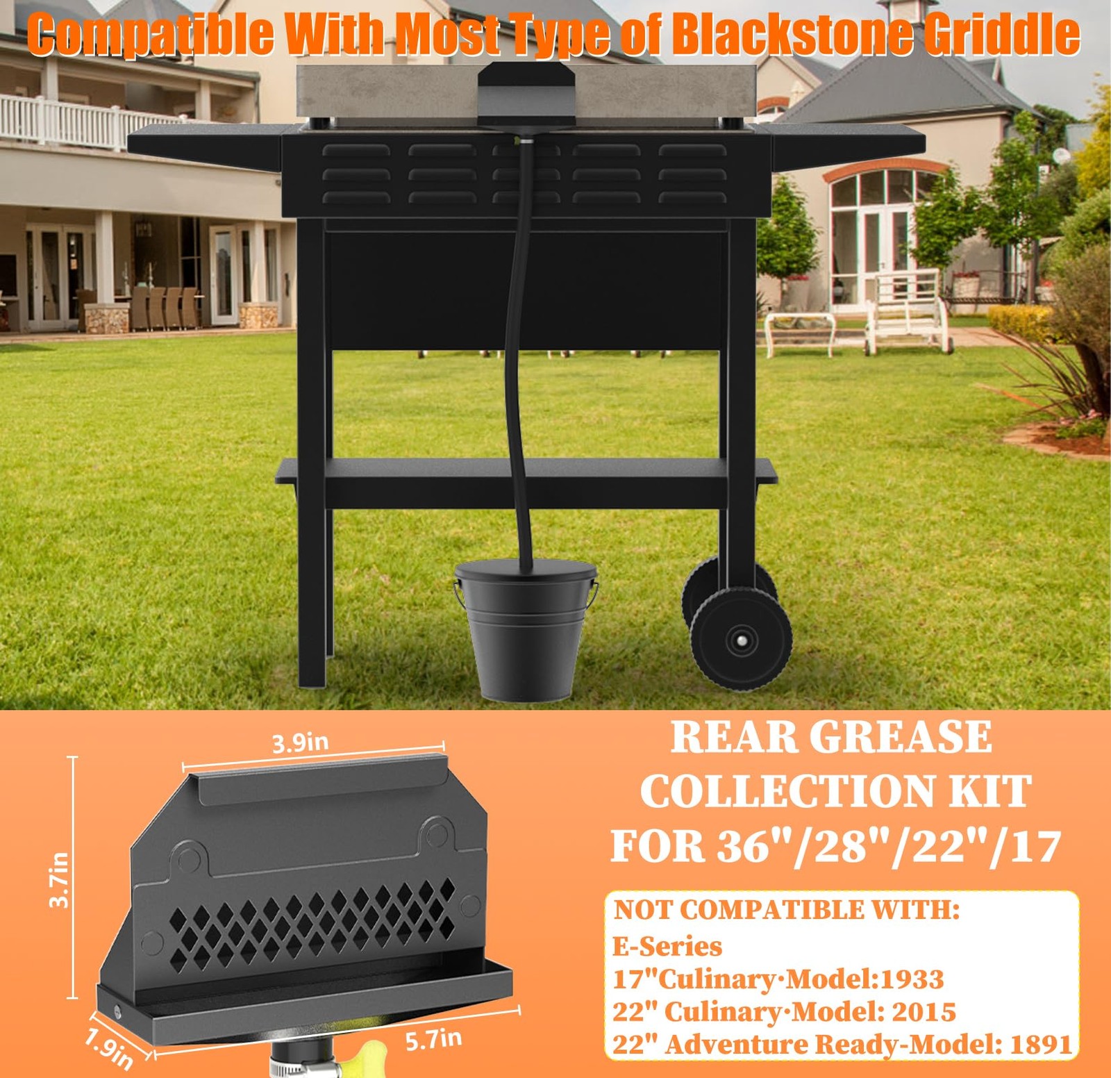 rear grease drainage system for blackstone grease catcher rear grease drainage funnel for blackstone rear grease drainage system for blackstone rear grease drainage funnel for blackstone grill griddle rear grease exit rear grease drainage catcher rear grease drainage for blackstone rear grease drainage funnel rear grease drainage catcher for blackstone rear grease drainage for blackstone 🥩 EASY TO USE, ONE STEP: Enhance your cooking experience and get rid of the hassle of repeatedly emptying the traditional grease tray of Blackstone. Simply attach the heat-resistant silicone hose to the grease funnel with the clip and hang it on the grease outlet at the back of the grill. The silicone hose quickly guides grease to the grease bucket with lid, keeping the grill area clean. Enjoy hassle-free grilling, it's that simple! 🥩 COMPATIBLE WITH BLACKSTONE GRILLS: This rear grease drainage funnel fits most Blackstone grills, including 17/22/28/36 inch models. The upgraded design will not interfere with the use of Blackstone accessories such as wind guards, hood or lid. Note: Do not fit for Blackstone E-Series, Culinary-Series and models 1891/1899/2151! 🥩 ENHANCED GREASE COLLECTION: This rear grease system for Blackstone comes with an enlarged grease bucket and disposable aluminium foil cups with 2.5 times the capacity of a standard drip tray. Perfect for hosting large family or friend BBQ parties. The grease bucket measures 6.77 x 4.33 x 6.34 inches, foil liner measures 6.38 x 3.86 x 6.06 inches. 🥩 DESIGN OPTIMISATION: The grease catcher for Blackstone with built-in magnets facilitates easy attachment to the grease drain at the top of the grill. The integrated rear grease gate prevents food from falling into the grease tray, especially when cooking or preparing foods such as stir-fries. 🥩 HIGH TEMPERATURE RESISTANT MATERIAL: Both the grease funnel and the grease bucket are made of heavy-duty coated steel that is resistant to heat, corrosion and rust, ensuring durability. Meanwhile, the included 3.5-foot heat-resistant silicone hose can withstand temperatures up to 572°F for easy collection of hot grease. Hose lengths can be cut as needed. 🥩 PERFECT BBQ ASSISTANT: This enlarged griddle grease catcher is particularly suitable for use during large BBQs or when making large batches of bacon. It reduces the need for frequent cleaning of standard grease trays, allowing you to focus more on the fun of cooking. It is absolutely ideal for cooking enthusiasts.