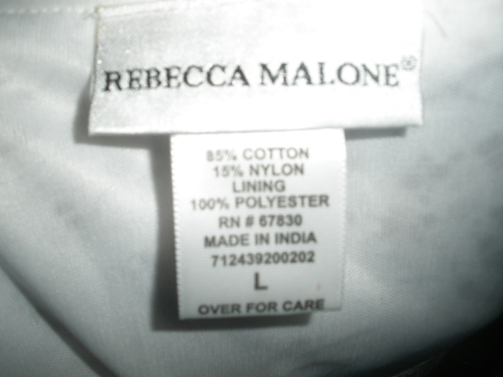 This is for Rebecca Malone Shirt. It is new with tags, It has no rips, tears or stains It is made of cotton, nylon, and polyester . The shirt is solid white. It is lined in white with a white lace overlay. it has long sleeves. MRSP is $40.00 It measures armpit to armpit laying flat is 22". It measures down the back 25". It is a size large If you have any questions or problems - before or after. Please message me.
