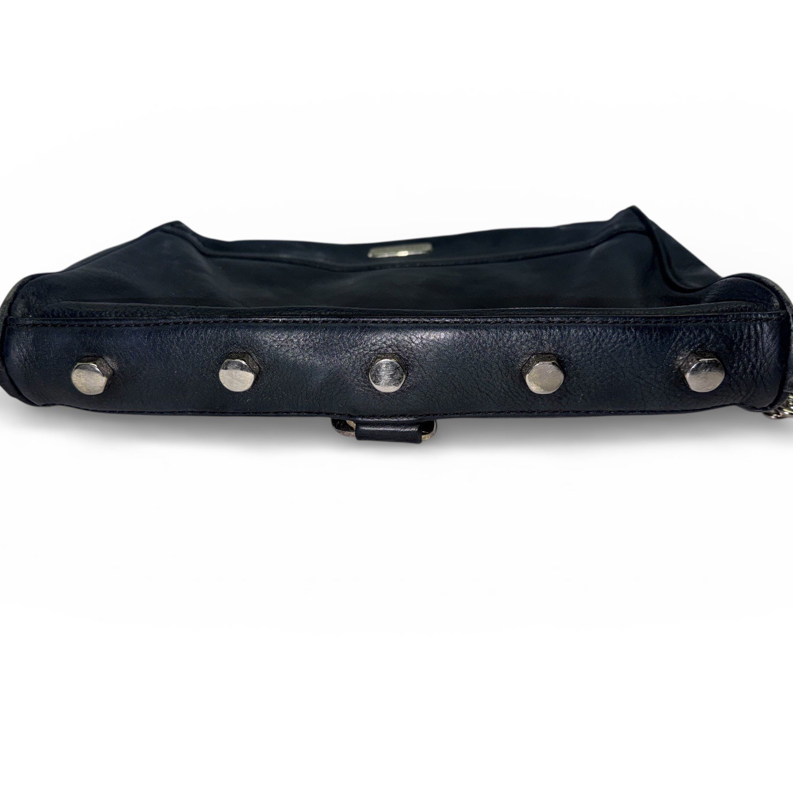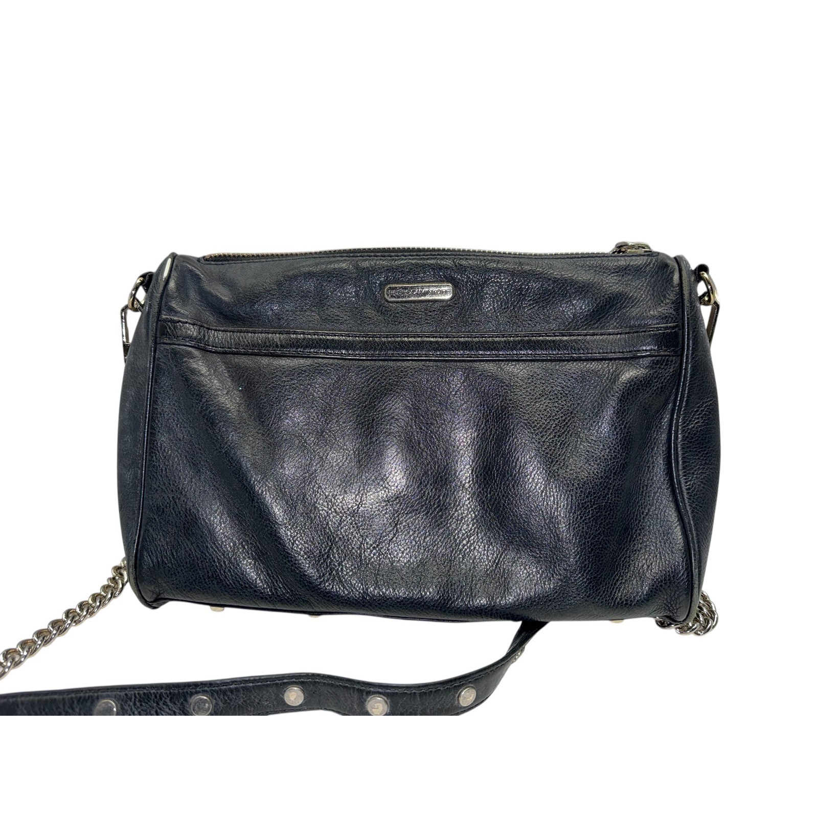Capture effortless cool with this Rebecca Minkoff black leather crossbody bag. Its supple leather embraces a chic, rock-inspired aesthetic, adorned with signature studs that catch the light with every movement. The versatile silver-tone chain strap offers a touch of edgy glamour, transitioning seamlessly from day to night. Exterior Material: Leather Style: Crossbody Exterior Color: Black Department: Women Product Line: Rebecca Minkoff Lining Material: Fabric Hardware Color: Silver Closure: Zip Accessories: Detachable Strap Bag Height: 8 in Bag Depth: 3 in Theme: Designer Accents: Studded, Zipper Keywords: crossbody bag, shoulder bag, studded bag, designer handbag, luxury leather, evening bag, street style, edgy fashion, glamorous, chic accessory, silver hardware, fashionista