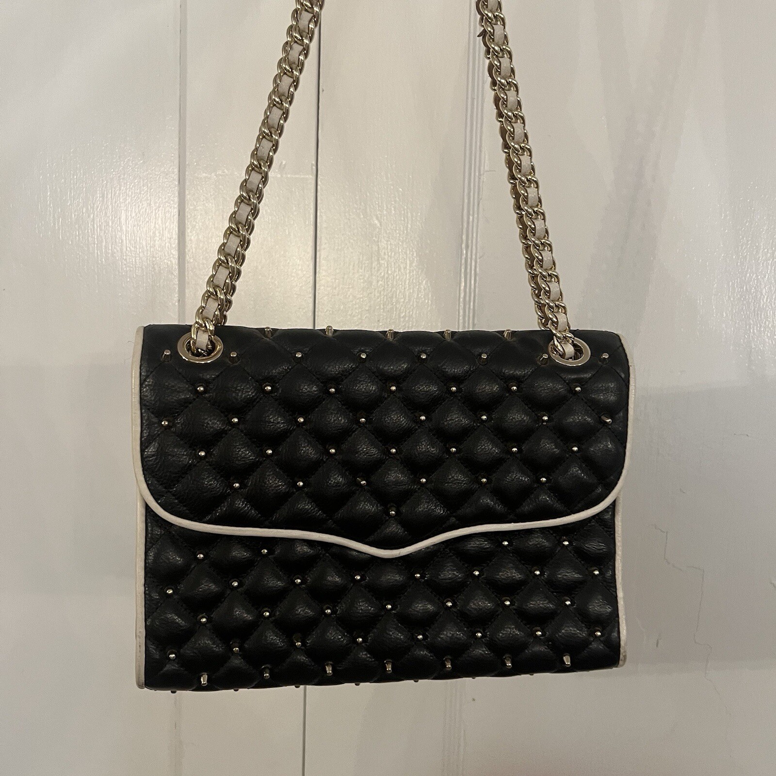 Elevate your style with this stunning Rebecca Minkoff Quilted Affair Studded Purse. The black and white leather exterior is accented with silver studs and gold hardware, while the white lining and handle/strap add a touch of elegance. The crossbody/shoulder style is perfect for on-the-go convenience, and the snap closure ensures your belongings are secure. This purse is brand new with tags and is the perfect addition to any wardrobe. The exterior material is leather and the finish is quilted. The accents of studs and hardware add a touch of edginess to this classic black and white design. The purse is also spacious enough to hold all of your essentials.