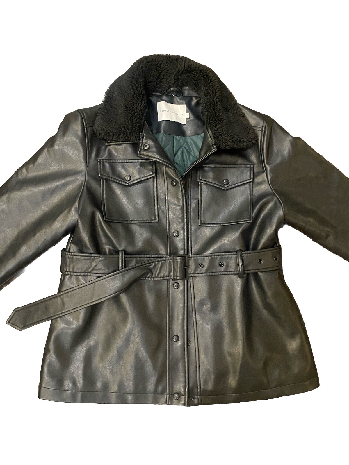 This stylish Rebecca Minkoff Faux Leather Jacket with a cozy Shearling Collar, perfect for winter and fall. It features a mid-length design that can be worn open or with a snap and belt closure. The shearling collar is removable. The interior lining is a gorgeous green and quilted. Pre-owned, barely worn. Excellent condition RN 164825 Measurements: Length: 27 inches Width: 22 inches