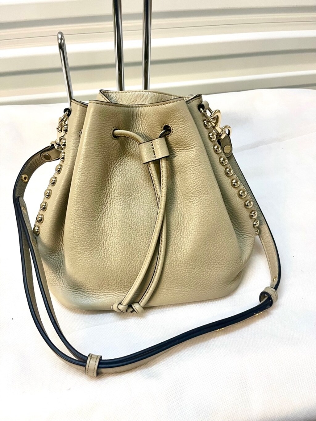 Rebecca Minkoff Studded Leather Bucket Bag Beautiful green Leather Gold-Tone Hardware Single Shoulder Strap Studded Accents Leather Lining Drawstring Closure at Top Measures 12” W, 9” H, 5” D