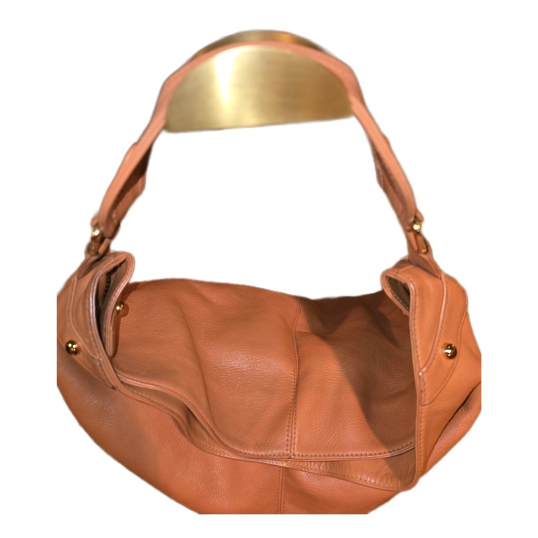 The Rebecca Minkoff Nikki British Tan Leather Satchel Bag with Chrome Accents is a stylish and versatile handbag suitable for various occasions including travel, casual outings, workwear, and business meetings. Made of pebbled leather with silver hardware accents, this large square-shaped bag features a magnetic closure and an adjustable detachable shoulder strap for convenient carry. The bag includes inner pockets for organization and a lined interior, making it a practical yet fashionable choice for women on the go. The unique buckle and strap accents add a touch of designer flair to this city-inspired piece from the Rebecca Minkoff Nikki collection.