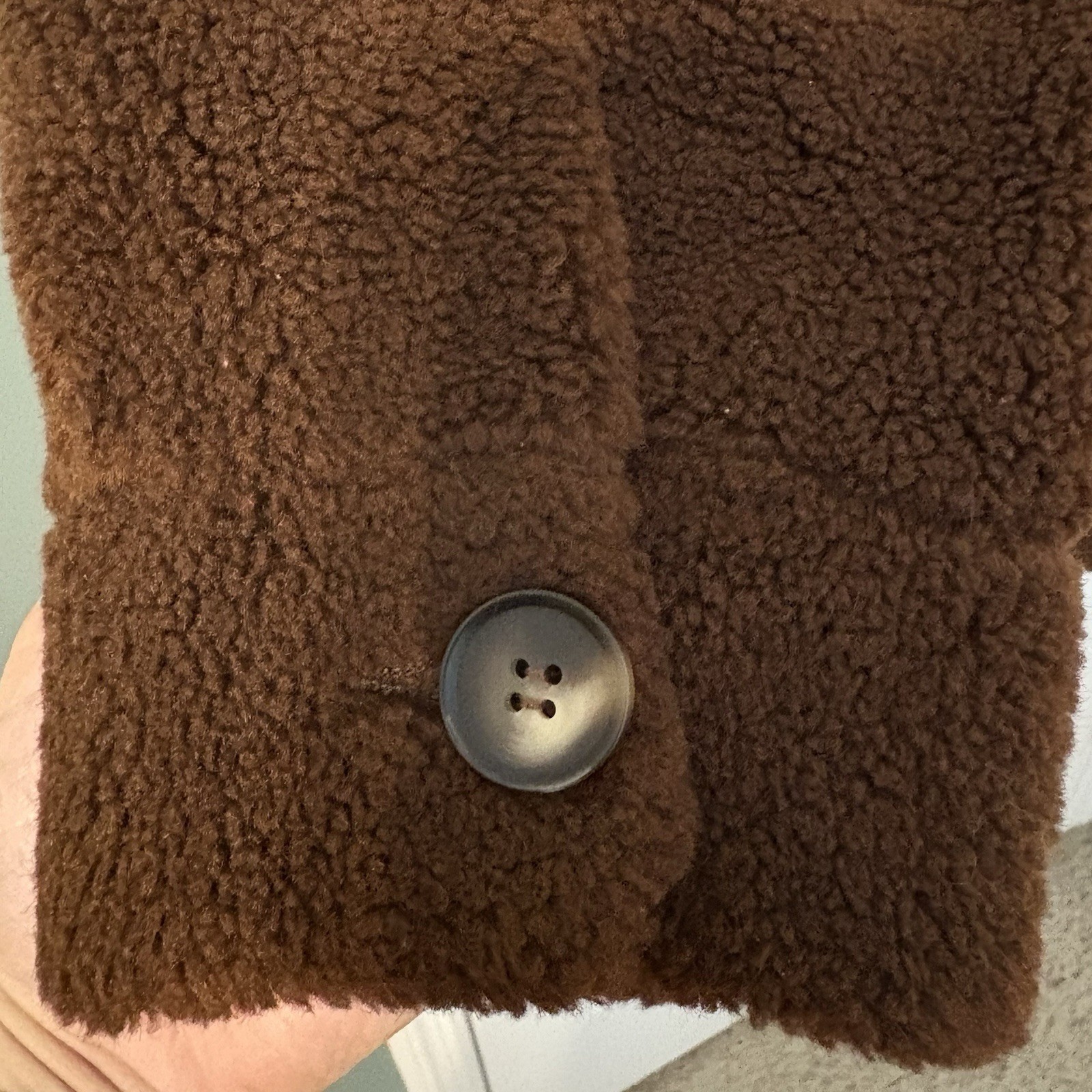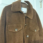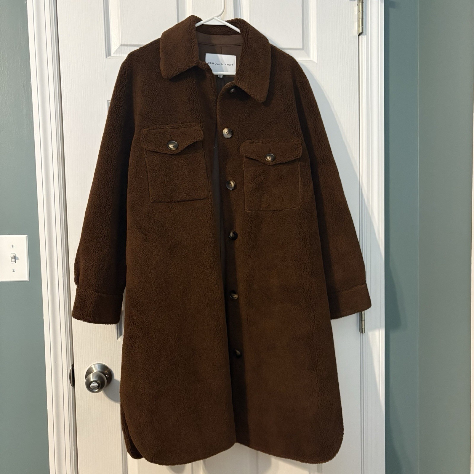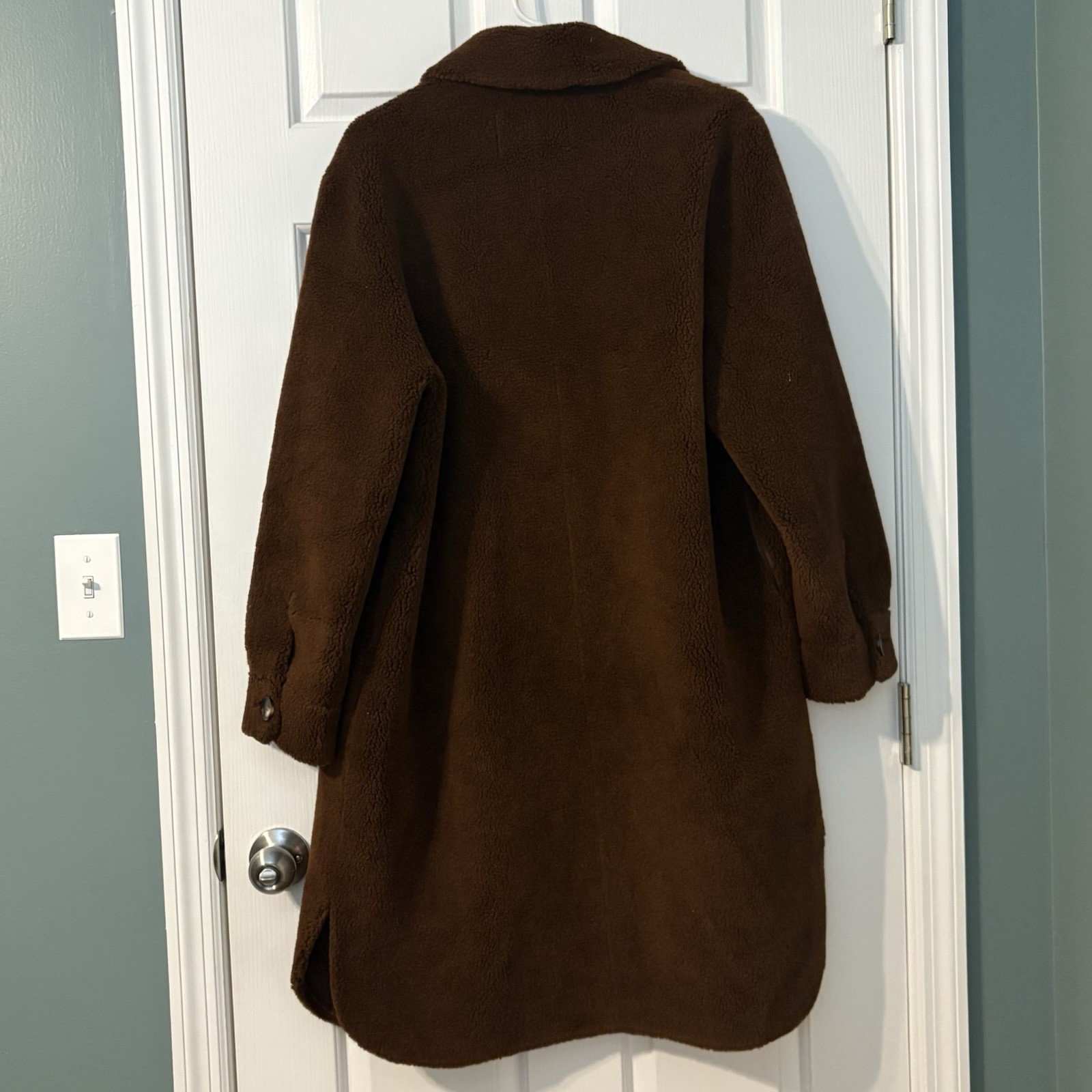The Rebecca Minkoff Women's Teddy Sherpa Long Jacket in Brown, Size L is a cozy and stylish outerwear option for women. Made from polyester and wool with a polyester lining, this jacket is perfect for casual occasions during the winter and fall seasons. The long length provides extra coverage and warmth, while the basic jacket style from the renowned brand Rebecca Minkoff adds a touch of sophistication to any outfit. Perfect for staying comfortable and fashionable in colder weather. Length 40” Arm length 23”