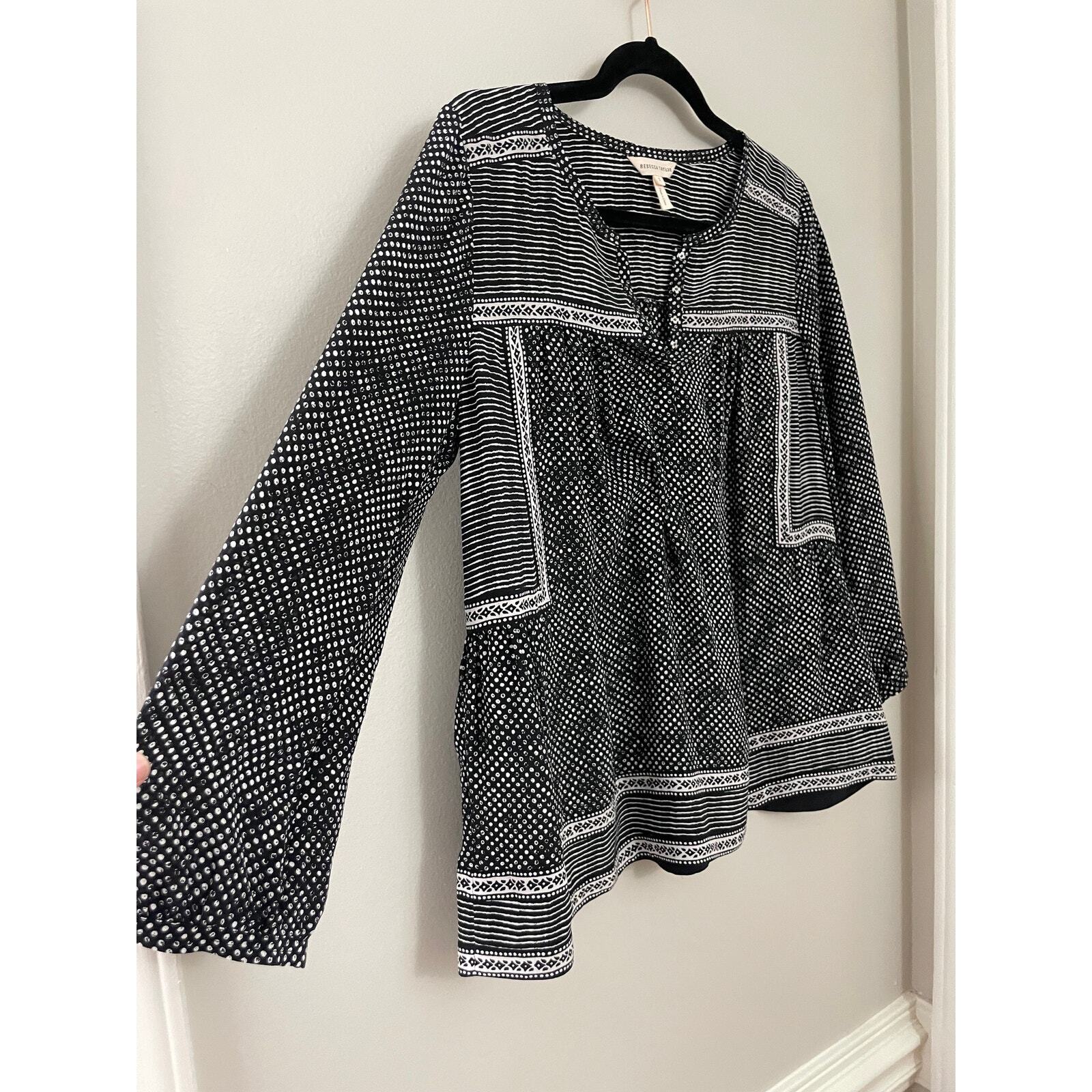 Rebecca Taylor 100% Silk Monochromatic Boho Patchwork Print Silk Blouse Size 2. This is generously sized- it would work for an oversized small. See photos for details. Patchwork silk is equal parts luxurious and laid-back on Rebecca Taylor's stitched design. Shirred detailing, round neck, partial snap placket, button cuffs. Retailed $325. Excellent used condition, no flaws noted. Smoke free pet friendly home. Check out my other listings for a bundle deal!