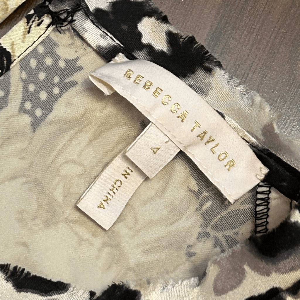 Rebecca Taylor women’s gold leaf fleur 100% silk blouse size 4 Ties at 3/4 sleeves Sheer mixed media design Button keyhole closure in back 100% silk Dry clean only Pit to pit 18 1/4 inches Length 23 inches