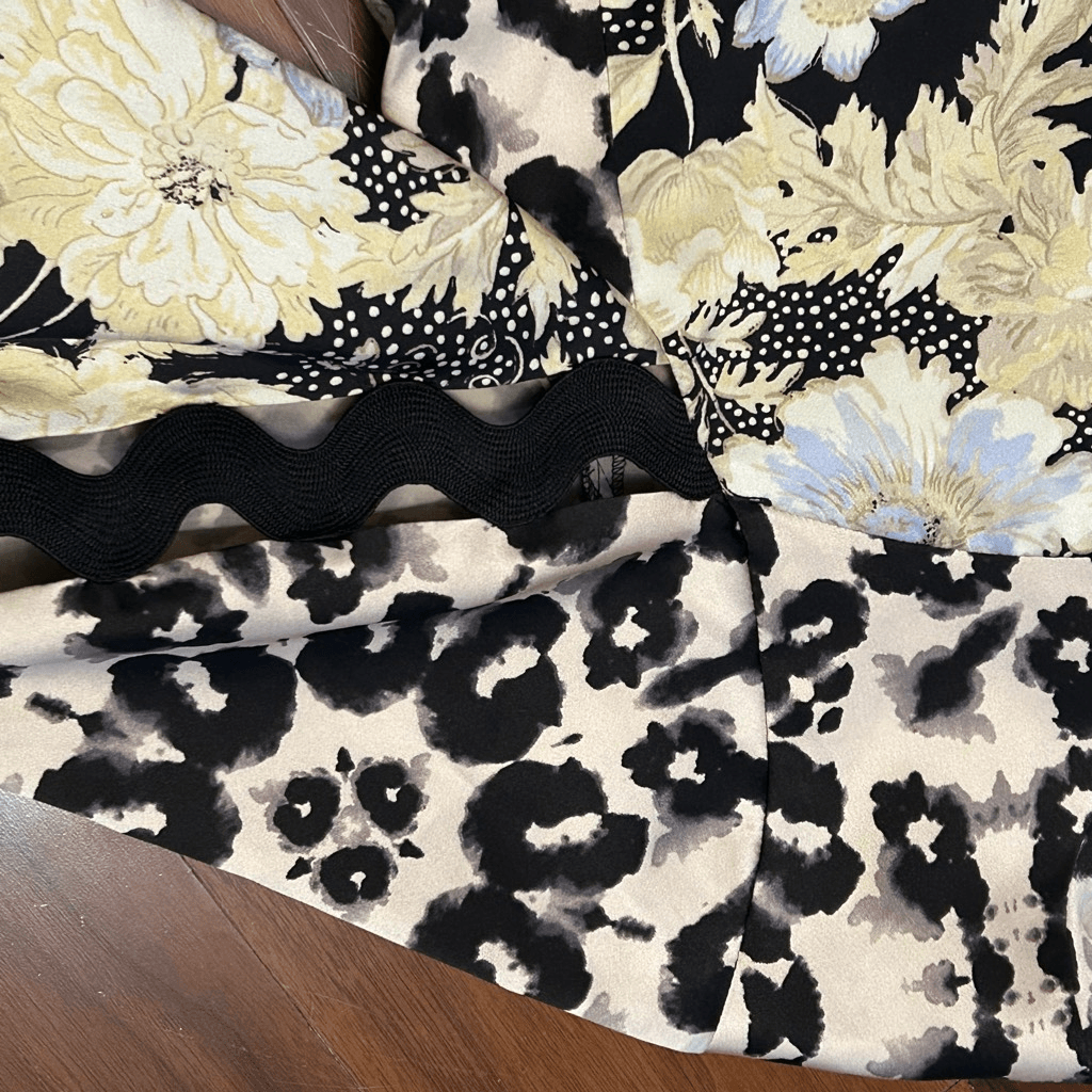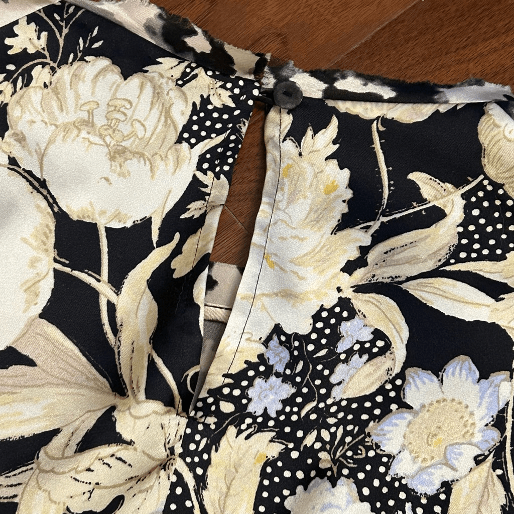 This blouse is absolutely stunning! The gold leaf fleur design is elegant and eye-catching, while the silk feels luxurious and soft. The 3/4 sleeves with ties add a chic touch, and the sheer mixed media detail makes it unique. The back keyhole closure is a stylish surprise. Perfect fit for a size 4—flattering and comfortable. A must-have for anyone who loves high-end, feminine pieces. Just be sure to dry clean it to keep it looking flawless!