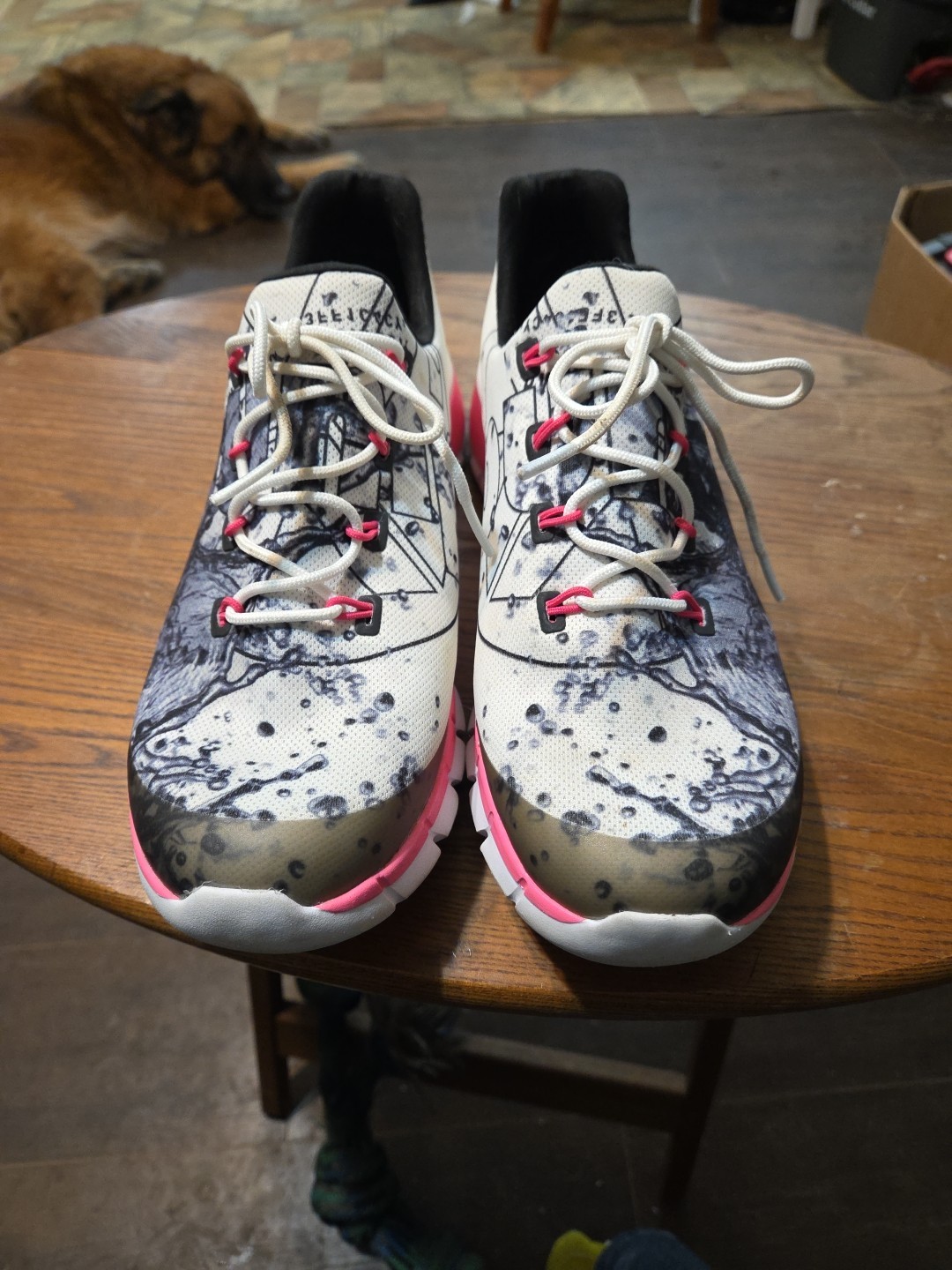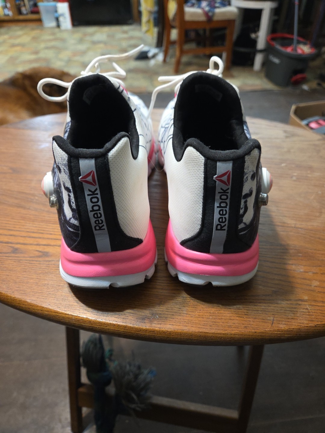 Unique Pink and Black running shoes, Reebok air pump. Air pump works on both shoes.