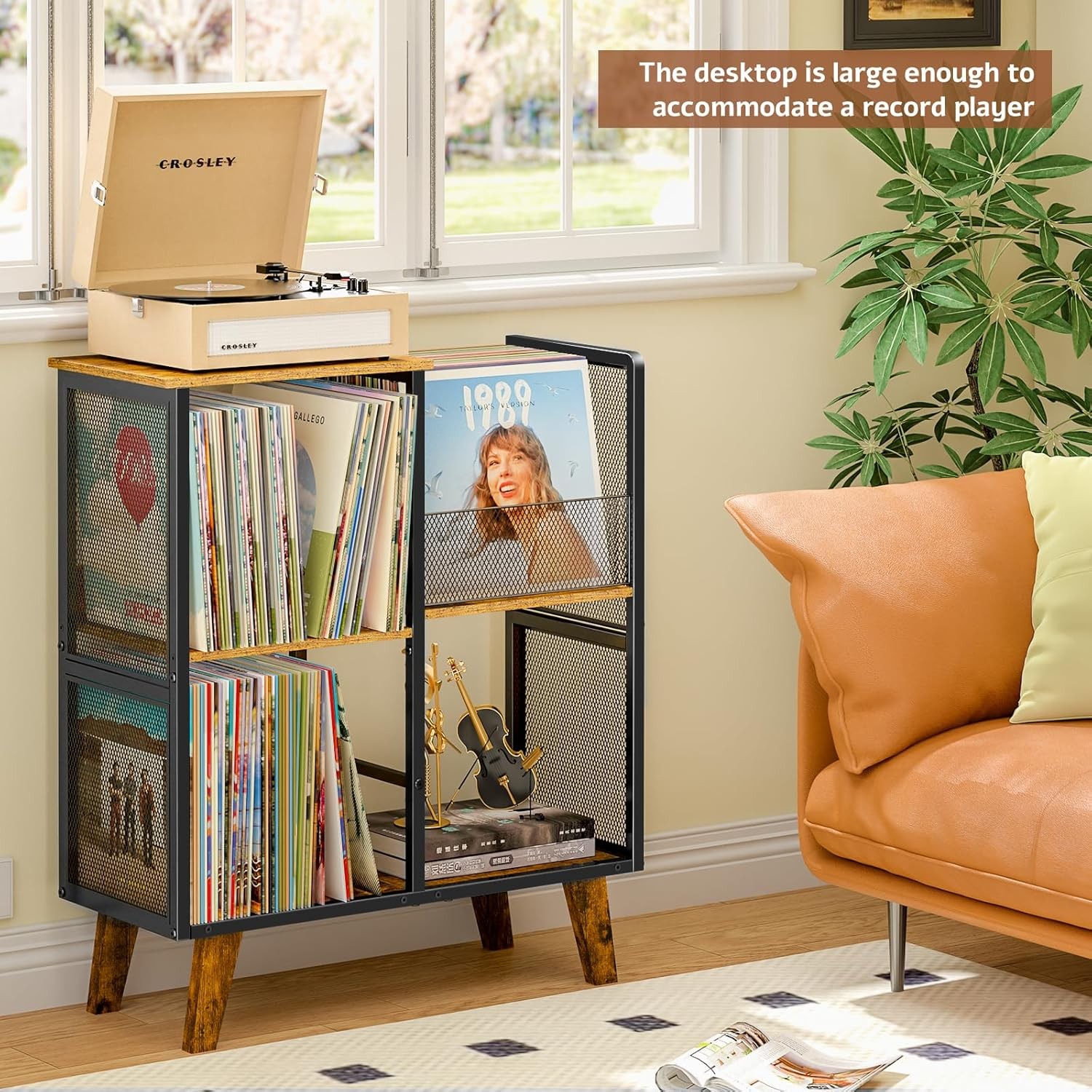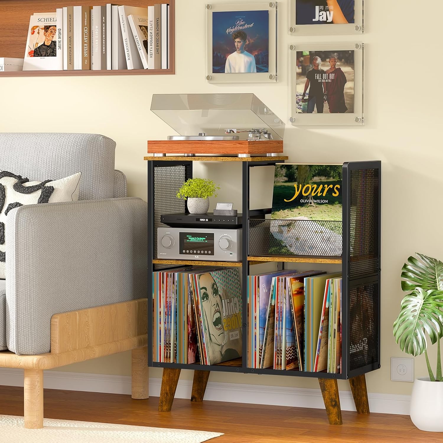 Record Player Stand, 3 Tier Side End Table with Vinyl Record Storage Basket, Tu