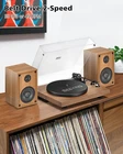 Items in the package: Turntable Turntable lid Turntable slip mat Turntable platter 45RPM adapter Tonearm counterweight Belt drive Power adapter 2*18W included speakers Speaker wire*2 PC-USB link cable user manual, warranty card Specifications: Power output: DC 15V, 2.4A Power consumption: 70W Speed: 33 1/3 RPM or 45 RPM Size: 7” 10” 12” Dimensions (L x W x H): 16. 46” x 13. 62” x 4.84” (lid closed) 16. 46” X15. 55” X16. 14” (lid open) Weight: 20. 69bs Speaker Output Power: 2 x 18W Speaker dimensions: 6. 3” x 6. 2” x 9. 8” 2*18 W Bookshelf Speakers: produce natural, well-balanced studio sound with massive bass, sounds with minimal distortion and decent tonal quality. Offer exquisite craftsmanship and aesthetics, match room decoration Iron Platter & Accurate Counterweight: Hefty platter is designed to reduce vibration and increase the clarity of the sound, better for stable rotation. The counterweight can independently adjust the tracking force of the needle accurately Moving Magnet Cartridge & Static-Balanced Tonearm: This cartridge produces moderate to high output levels, works into standard phono inputs on a stereo amplifier or receiver. Also features a robust aluminum tonearm and vibration-damping belt-drive system Bluetooth Streaming & Vinyl Recording via PC: the built-in receiver allows you to listen to music via smart phone, tablet or other compatible devices. It also supports USB to PC encoding, which converts vinyls into MP3 digital files via computer Built-in Preamp & Analog Phono-Line Output: Built-in switchable Phono-line and pre-amplifier allow to connect with the set of included speakers, or if you prefer to connect with your speakers or stereo system, take advantage of the turntable’s RCA jacks
