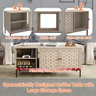 Description Product Features Handmade veneer weave style:The eco-friendly, nature-friendly wood veneer is hand-woven as a stylistic element of our coffee tables,It is naturally matched with the minimalist, bohemian, modern and rustic home decoration style, and the style is highlighted. Ample Storage Space:The coffee table consists of open storage space and a couple of hidden storage spaces, which is more space-saving and makes your desktop tidy. The hidden storage cabinets can be adjusted by adjusting the partition in the middle as a way to allow you to customize the storage space. Smoothly Sliding Doors:The coffee table comes with removable veener doors that slide for easy access to items and allows you to open the doors without having to tuck your legs. Compared to drawer design, sliding design are more convenient.The slides are well made and the doors don't jam when sliding. Durable and Stable:The center table is stronger and more durable due to the use of high-quality materials. Metal legs ensure that the table won't shake easily, and the load-bearing capacity has also been significantly improved. Easy assembly:The coffee table comes with clear installation instructions, so following the steps in the manual makes it easy to complete the installation. Handmade Veener Weaving Design Natural double-color veener weaving door It is naturally matched with the minimalist, bohemian, modern and rustic home decoration style, and the style is highlighted. Smoothly Sliding Door Compared to drawer design, sliding design are more convenient.The slides are well made and the doors don't jam when sliding. Ample Storage Space The coffee table consists of open storage space and a couple of hidden storage spaces, which is more space-saving and makes your desktop tidy. Durable and Stable The cabinet is stronger and more durable due to the use of high-quality materials. Metal legs ensure that the cabinet won't shake easily, and the load-bearing capacity has also been significantly improved. Product information Product Size Item:L41.73''×W19.70''×H18.70'' Left Shelf:13.2''×9.5''×6'' Middle Shelf:14''×20''×12.6'' Right Shelf:13.2''×9.5''×12.6'' Net Weight 57.00lbs Color Natural wood Material Natural hand-woven veneer Engineered wood Metal base and legs Number of Shelves 7 Number of Sliding Door 4 Package Contents: 1 x Coffee Table Note: 1. Please allow 0-2 cm error due to manual measurement. Thanks for your understanding. 2. Monitors are not calibrated same, item color displayed in photos may be showing slightly different from the real object. Please take the real one as standard. 3. Please kindly note that this product needs to be assembled by yourself.