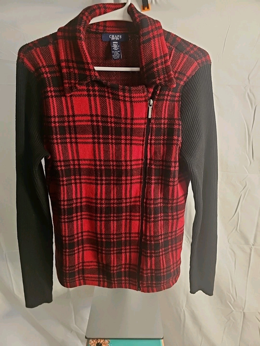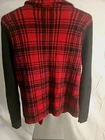 This Chaps Zip Up Red & Black Plaid Flannel Jacket with Knit Sleeves in size Petite S is a stylish and colorful addition to any woman's wardrobe. Made from a cotton blend outer shell with acrylic lining, this short-length jacket features a full zipper closure and is accented by the brand Chaps. The plaid pattern and knit sleeves add a trendy touch to this basic jacket, making it perfect for a casual yet fashionable look.