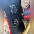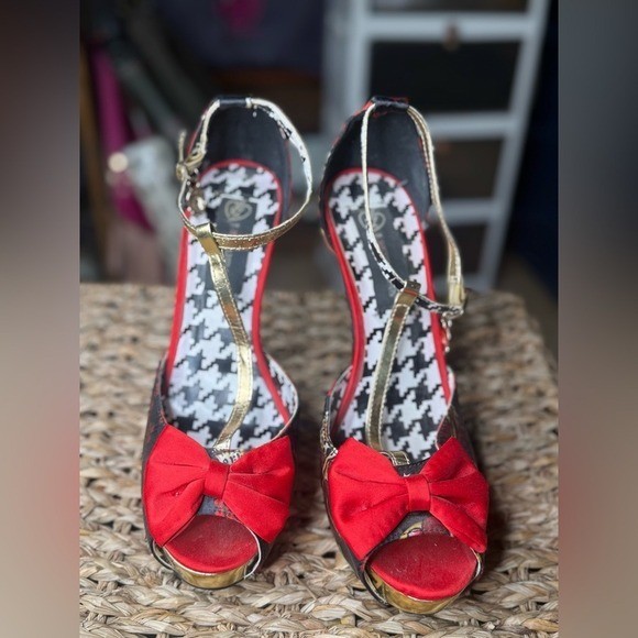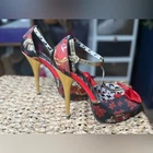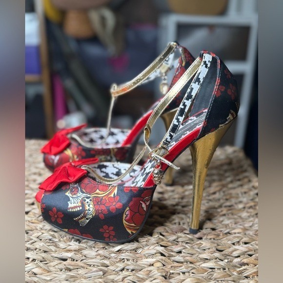 Step into bold, vintage-inspired glamour with these striking Gothic Pinup Platform Heels. Featuring a black and red floral skull print with metallic gold accents, these statement heels are perfect for anyone who loves rockabilly, pin-up, or alternative fashion. The red bow peep-toe detail and skull charm ankle straps add an extra touch of edge and flair. Condition: Good pre-owned condition – minimal signs of wear on soles, some peeling on the inside of the strap and a mark on one heel please see pictures. Size 9 no box Features: Red & black floral skull print fabric Peep-toe with red bow detail Metallic gold ankle straps with skull charm Gold stiletto heel Platform sole for added comfort Rockabilly, gothic, and pinup style Size: 9 Material: Fabric upper / synthetic sole Perfect For: Burlesque looks, costume parties, vintage styling, gothic glam, and collector shoe displays. Keywords: Gothic heels, skull shoes, platform stilettos, rockabilly heels, pinup shoes, red and black high heels, sugar skull shoes, Day of the Dead heels, gold heel shoes, edgy glam, burlesque shoes, statement heels, alt fashion