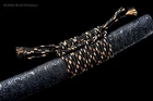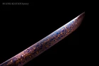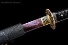 Red & Blue Dragon Sword 1095 Damascus Folded Steel Sharp Japanese Samurai Katana Product Parameter: Number: KT008 Sword style: Japanese samurai katana sword Blade material: 1095 carbon steel folded 15 times (32768 layers), damascus folded steel, 百炼钢 Overall length: 103cm/ 40.6" Handle: 26 cm/ 10.24'' Blade: 70cm/ 27.5'' Thickness: 0.7cm/ 0.28'' Width: 3.2 cm/ 1.26'' HRC(Hardness): 58 Bo-Hi: No blood groove, better hardness Samegawa: Black Fittings: Brass , dragon shape design Tang(nakago): Full tang , handle and blade is fixed by 2 bamboo mekugis vertically, very firm Pakage: 1sword with saya+1bag, the sword stand is not included. Craft: Handmade sword. Hand folded and forged, water quenching treatment, Hand-polishing, color electroplated, etc. * The steel we use is not the normal steel with the truck or cars or other life electrics, the steel use for the blade contents much more carbon and the purity can not be comparable . * It's a functinonal battle ready sword and has been sharpened. After our tests, it's sharp enough to cut bamboo, water bottles, braches and slice paper, etc. Note About us Sword Noun Explananation Delivery details Sword maintenance Note 1) We have already sent this item to the warehouse in America in advance. It's the lowest price we've ever had, and it's the lowest price on eBay . American customers can receive the packages 1-7 days after placing an order. 2) Because the item is already in the warehouse in the United States, we are sorry that we cannot add free carving service & replacement parts service for the moment. 3) We have free return service. If you don't like anything after you receive the package, we will bear the loss of return. Please feel free to buy. About us We have our own sword-casting factory. The factory is located in Longquan, a small town with a long history of sword-casting in China. Most of the famous Swords in China are made there. Rich raw materials, skilled technology, traditional sword casting technology from generation to generation. Manual production really takes a lot of time. We will prepare most products in advance,and arrange delivery within about a week. However, sometimes the delivery time is delayed due to weather or raw materials,etc. we hope to get your understanding. Feel free to contact us to inquire about the status of your order. Each handmade sword is unique. Our swords are great for gifts or for your own collection. Our swordsmithing master makes every sword attentively, hope you can feel our sincerity. We will also give you the best customer service, any questions please feel free to contact us. Sword Noun Explananation Quenching After the blade has been shaped, the sword would be quenched. We quench our swords in either water or oil. Water quenching produces a tougher edge which can also be hardened further more using clay. Blades quenched in oil are still considerably hardened and do have superior flexibility compared to a water quenched blade. Folded Steel: In the forging process , the most useful process is the folding, where the metals are forge welded, folded, and welded again, as many as 124 times(15 times is the best). The folding removes impurities and helps even out the carbon content, while the alternating layers combine hardness with ductility to greatly enhance the toughness. The less impurities, the harder and sharper the blade will be. We have done cutting tests on the blades. it can cut bamboo(young bamboo tree), grass mattings and slice paper(The blade should be tilted at 45 degrees). Clay tempered: To maximize both the cutting edge and the resilience of the sword spine, a technique of differential heat-treatment is used.The sword is painted with layers of clay before heating, providing a thin layer or none at all on the edge of the sword, ensuring quick cooling to maximize the hardening for the edge.A thicker layer of clay is applied to the rest of the blade,causing slower cooling.This creates softer,more resilient steel, allowing the blade to absorb shock without breaking. About 1095 carbon steel: The best quality of high carbon steel is at 1095, the carbon content was 1.03%, and the element contains a small amount of chromium, molybdenum, vanadium, after heat treatment can reach HRc58-60 hardness, toughness is very good, but not resistant to rust, more be applied to traditional european-style hunting knife, large cutting knife and military dao. Such as the United States during world war ii "KA - BAR" saber is in 1095 as the blade material. Kobuse: The vast majority of modern katana and wakizashi are the maru type which is the most basic, with the entire sword being composed of a single steel. The kobuse type is made using two steels, which are called hagane (edge steel) and shingane (core steel). Steel of different materials is forged and welded together to hammer the basic shape of the sword. This allows the overall blade to have a higher toughness and absorb a lot of impact. Reducing the possibility of breaking or bending to some extent. Makes the blade not only has high hardness, but also has super toughness Delivery details a) If you do not receive the package, or the package is damaged during transportation. We'll take care of it. Please feel free to buy. b) If it is mentioned in the product description that the package includes the sword bag or sword holder, the style will be random. The sword holder or sword bag on the ebay picture is the props we use for shooting. If you really like a style, please contact us before buying. c) If you have any problem after recieve the package (wrong size, wrong style, etc.). We always provide you with the best after-sales service. Please give us a chance to help you before you give us a bad feedback . Thank you very much! Sword maintenance