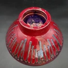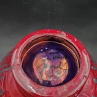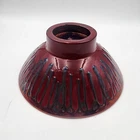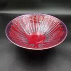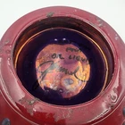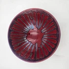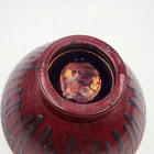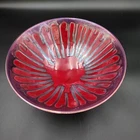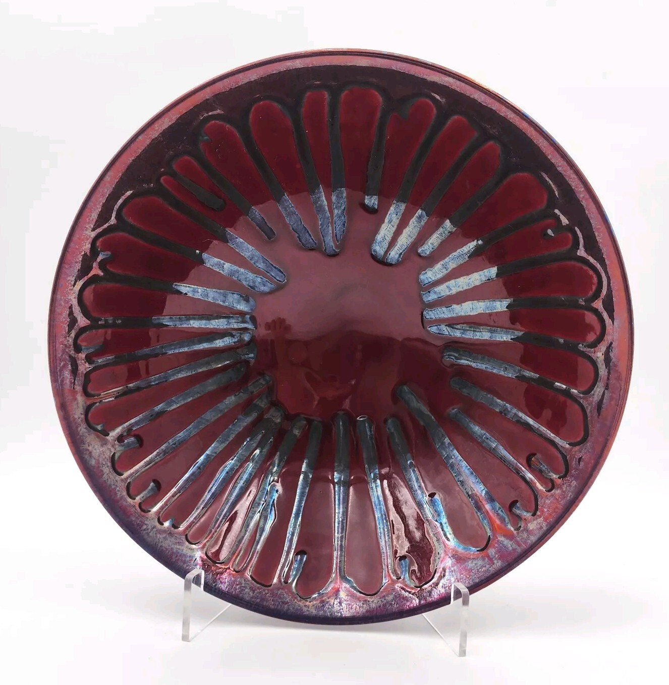 This ceramic console bowl measures 14" diameter and is intended for display. The red glazed pedistal bowl is contemporary in style, and its purple drip glaze is a node to mid-century modernism. This bowl is one of a kind and signed by the artist.