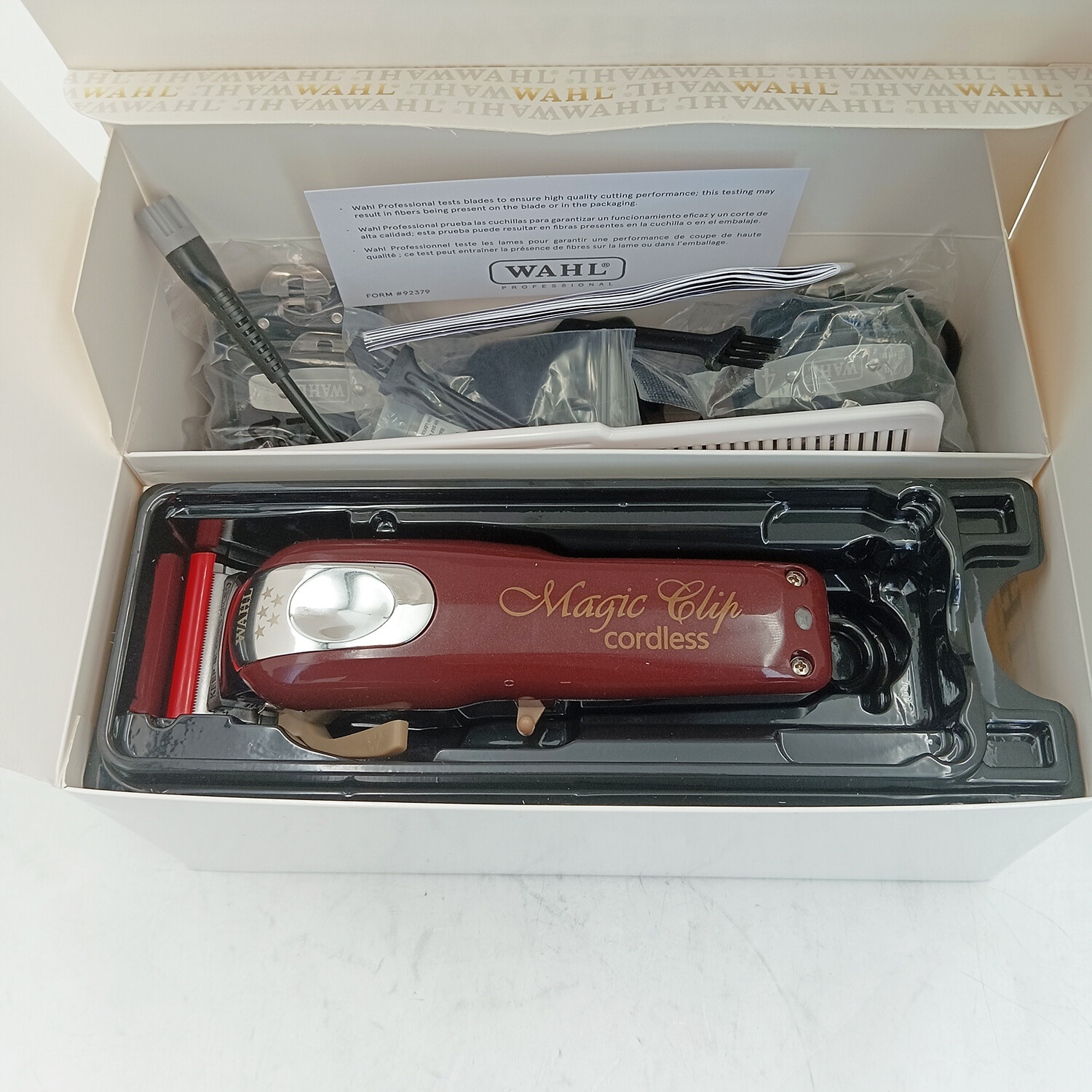 Product Description Red Clip Clipper Professional 5 Star Cord Cordless Magic #8148 Fade 100-240VAC Professional 5 Star Magic Clip Cord Cordless Hair Clipper Lithium-Ion Cord/Cordless Clipper has a 90+ minute run time, unique stagger-tooth blade for precision fades and blends, 2161 blade fits all standard Wahl attachment combs. Lightweight with sleek ergonomic design. Equipped with taper lever for easy fading and blending. Features: Lithium-Ion Cord/Cordless Clipper 90+ minute run time Unique stagger-tooth blade for precision fades and blends (blade only available for Cordless Magic Clip) 2161 blade fits all standard Wahl attachment combs Lightweight with sleek ergonomic design Equipped with taper lever for easy fading and blending Specifications: Cord Length: Corded>Clipper>8ft Unit length (lb): 6.25" Unit Weight (lb): 10.2 oz. Batteries Included: No Cord Length: Cord/ Cordless Transformer Motor Type: Rotary Magento Specification Accessories: 8 attachment combs (1/16" - 1"), oil, cleaning brush, styling comb, instructions, red blade guard & recharging transformer Voltage & Hertz: 120-60Hz Battery Type: Lithium-Ion MPN: 8148 Color: red Return policy About us Contact us Shipping If you need return, let us know the detailed problem and send us some pictures for confirmation. Then get an address for return or refund. 1.Customers may return an item for refund or exchange within 30 days after the item is received. Items must be returned in their original shipping and item packaging and should not be used. 2.We only accept our own parts without any broken. 3.Customers are responsible to the shipping back cost if you buy our item by mistake or change your mind. 4.Refund will only send once we receive the part from you without any problem.thanks 5.If a defective received (seldom happened), we will refund you or ship a replacement to you according to our inventory. (Not included the postage). 1. We value our customers tremendously. We are learning and improving our service better and better, and your satisfaction is the first thing that we pursue. 2. If any problem occurs, please contact with us at the first time. 3. Then we will try our best to solve the problem and make you pleased 4. And if you are pleased with this transaction, please don’t hesitate to leave a POSITIVE FEEDBACK and FIVE STARS on all of the Detail Seller Ratings. We will do the same for you. If have any problem, Please don't give negative feedback, Please contact us by message, we will do our best to service you .Thanks very much and have a good day! 1. Your order will be usually shipped out on the same day or the next day when you paid for it. 2. Shipping from the USA. 3. Handling time: 2 business day and 3 business day on weekend (Orders are not processed on holidays).Item is shipped to ebay address. Please leaving correct address can minimize delay. Return policy If you need return, let us know the detailed problem and send us some pictures for confirmation. Then get an address for return or refund. 1.Customers may return an item for refund or exchange within 30 days after the item is received. Items must be returned in their original shipping and item packaging and should not be used. 2.We only accept our own parts without any broken. 3.Customers are responsible to the shipping back cost if you buy our item by mistake or change your mind. 4.Refund will only send once we receive the part from you without any problem.thanks 5.If a defective received (seldom happened), we will refund you or ship a replacement to you according to our inventory. (Not included the postage). About us 1. We value our customers tremendously. We are learning and improving our service better and better, and your satisfaction is the first thing that we pursue. 2. If any problem occurs, please contact with us at the first time. 3. Then we will try our best to solve the problem and make you pleased 4. And if you are pleased with this transaction, please don’t hesitate to leave a POSITIVE FEEDBACK and FIVE STARS on all of the Detail Seller Ratings. We will do the same for you. Contact us If have any problem, Please don't give negative feedback, Please contact us by message, we will do our best to service you .Thanks very much and have a good day! Shipping 1. Your order will be usually shipped out on the same day or the next day when you paid for it. 2. Shipping from the USA. 3. Handling time: 2 business day and 3 business day on weekend (Orders are not processed on holidays).Item is shipped to ebay address. Please leaving correct address can minimize delay. powered by