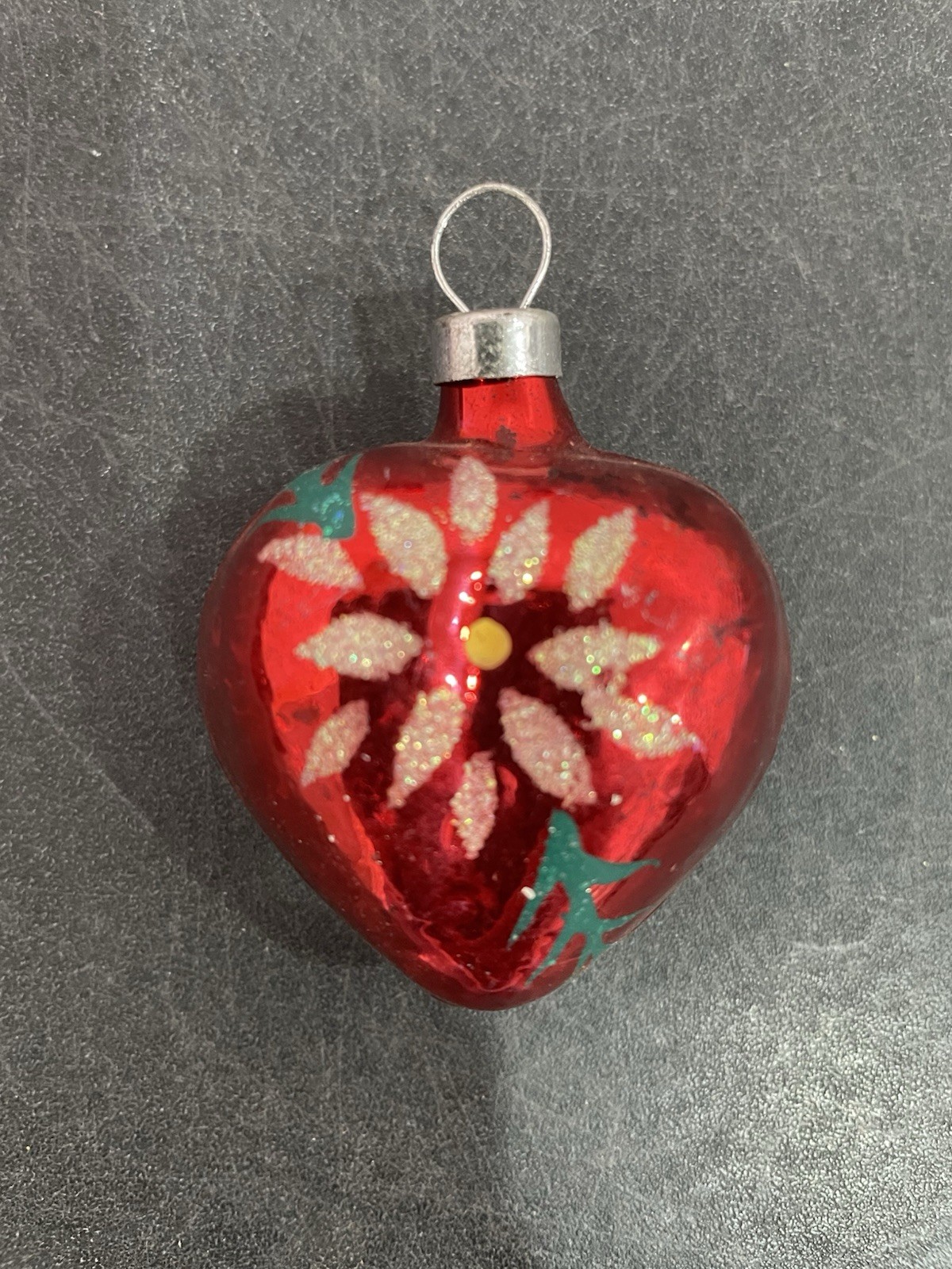 This is a vintage red heart shaped glass Christmas tree ornament. It has a white glitter poinsettia on both sides. It measures 2 1/4" tall. Some tiny missing paint spots. M2-10