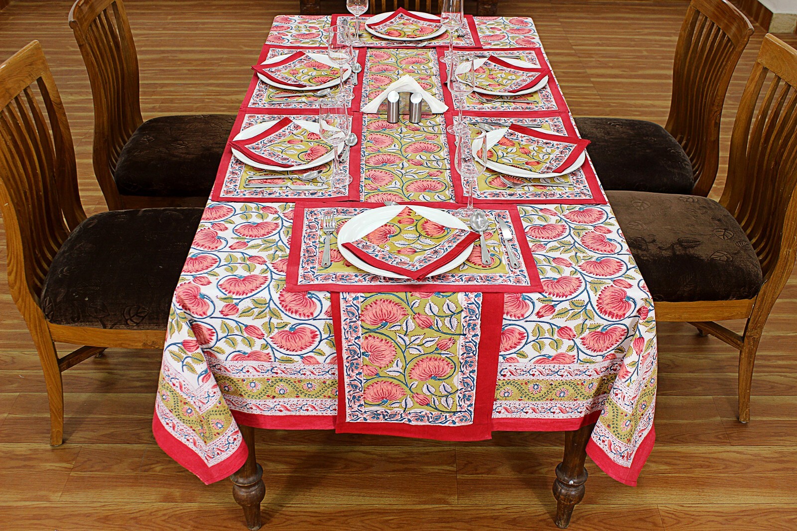 WELCOME Beautifully handcrafted Wooden Block Printed Cotton Table Cover, created by local artisans of India, designed using classic, ethnic and royal prints as inspirations. Our block printed textiles are not only Eco-friendly but also sustainable made using finest quality cottons and best quality organic printing colors. This Table Cover is the perfect go-to shot for accessorizing your table. It stands out as a statement piece, delighting the surrounding space with fine aesthetics. To check our more of our product range, please visit our shop link - https://www.ebay.com/str/homespuncraft Product Details - Design: Floral, Royal & Classic Technique / Print: Wooden Block Printed with Hands Material / Yarn Type: 100% Natural Cotton Color: Red and White Dimensions/Sizes Available - Shape: Rectangle/Square 4 Seater: 60 X 60 inches (150 X 150 Cm.) 4 Seater: 72 X 72 inches (180 X 180 Cm.) 6 Seater: 60 X 90 Inches (150 X 225 Cm.) 6 seater: 48 x 102 Inches (120 X 260 Cm.) 8 Seater: 90 X 90 Inches (225 X 225 Cm.) 8 Seater: 72 X 108 Inches (180 X 275 Cm.) 8 Seater: 110 X 110 Inches (280 X 280 Cm.) 10 Seater: 72 X 118 Inches(180 X 300 Cm.) 12 Seater: 72 X 135 Inches (180 X 345 Cm.) 12 Seater: 72 X 140 Inches (180 X 355 Cm.) 12 Seater: 80 X 120 Inches (200 X 305 Cm.) 14 Seater: 72 X 160 Inches (180 X 405 Cm.) 16 Seater: 72 X 180 Inches (180 X 460 Cm.) 16 Seater: 72 X 190 Inches (180 X 480 Cm.) Shape: Round 4 Seater round: 60 X 60 Inches Round (150 X 150 Cm. Round) 4 Seater round: 72 X 72 Inches Round (180 X 180 Cm. Round) 6 Seater round: 90 x 90 Inches Round (225 x 225 Cm. Round) 8 Seater round: 110 x 110 Inches Round (280 x 280 Cm. Round) Table Runner - Wide - 20 Inches for all sizes (50 Cm. for all sizes) Length - Same length as the length of the table cover selected For Example, for a 72 x 140 Inches table cover order, the runner size would be 20 x 140 Inches. For a 60 x 90 Inches table cover order, the runner size would be 20 x 60 Inches and so on… Napkins: 16 X 16 Inches (40 X 40 Cm.) Table Mats: 13 x 18 Inches (35 x 45 Cm.) Number of Napkins and Table Mats shall be same as per the number of seater ordered. For Example, for a 4 seater table cover ordered, it would be a set of 4 napkins and 4 table mats. For a 6 seater table cover ordered, it would be a set of 6 napkins and 6 table mats and so on… Wash & Care Recommendations Wash Separately Preferably If Machine wash: Gentle cycle at 30°C If Hand wash: In Cold Water with mild or organic liquid detergents and air dry for longer durability and colour vibrancy Tumble dry: Low setting Iron: Low heat setting //Do not Soak. Do not use harsh detergents. Do not bleach. This Hand Block Printed Cotton Table Cover can be used for: Dining Table ,Coffee Table , Centre Table , etc. NOTE-1 - All our textiles are handmade and are worked on by multiple artisans and the product goes through multiple hand-processes. Hence, there could be a very little variation than the actual look from the photos, which indeed is the characteristic of this handmade textile giving it an authentic handmade look. NOTE-2 - Actual colors may slightly vary from the colors shown in the pictures due to different monitor screen settings, photography setup with natural lights and the nature of the product, being 100% hand made. NOTE-3 - Also please note that as per the policy mentioned on Ebay on the product page, any import duty, taxes occurred in the client's country will be borne by the client. Normally it does not occur. Thank You very much for visiting our store.