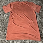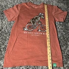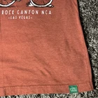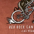 This is a men's size small red T-shirt featuring a graphic print of Red Rock Canyon NCA in Las Vegas. The shirt has a crew neck and short sleeves, made of a polyester and cotton knit fabric that is lightweight and easy to care for. The design includes a donkey and bike illustration, with accents of the Wild Tribute 4 The Parks logo, embodying themes of nature, national parks, camping, biking, and the outdoors. This athletic fit shirt is suitable for all seasons and is a souvenir for those who enjoy travel and wilderness destinations.