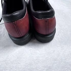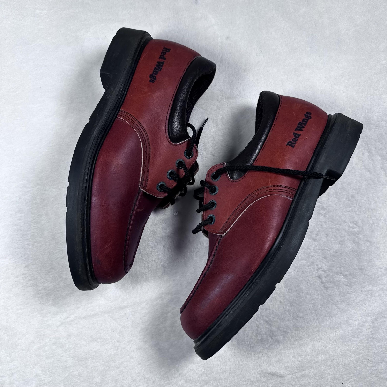 Brand: Red Wing Shoes Style: Mens leather oxford work/casual shoes with moc toe stitching and lace-up closure. Color: Burgundy red uppers with black padded collar, black laces, and black rubber outsoles. Size on shoe: Mens Size 9.5 can’t read tag or imprint see measurements of insole Style/Model code stamped inside: 1505. Materials: Leather uppers, cushioned textile lining, removable insole, and oil-resistant rubber outsoles with Red Wing Shoes branding. Details: Round moc toe, 4-eyelet lacing, padded collar, comfortable low-profile design, and durable slip-resistant tread suitable for work or everyday wear.