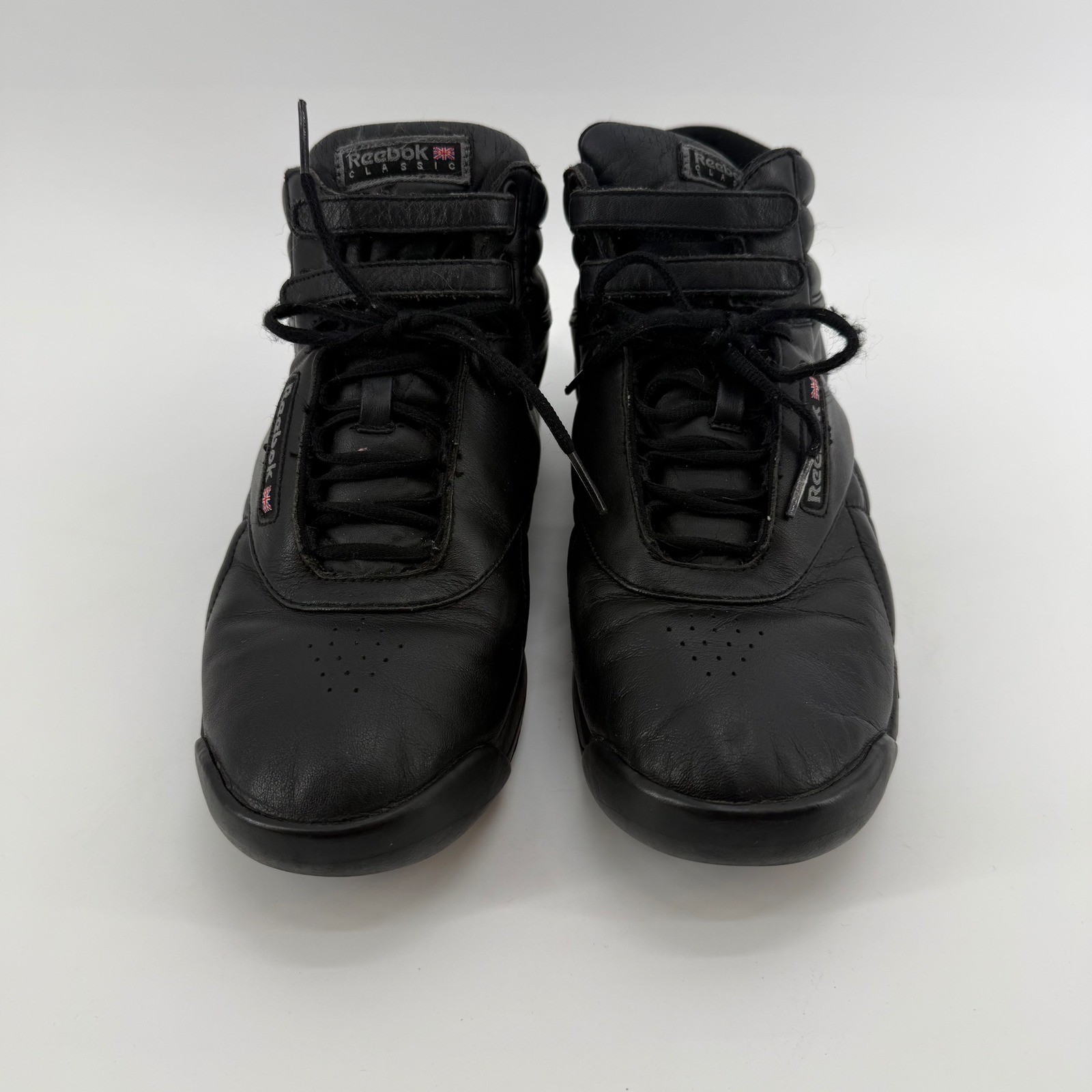 Glue on toe is coming apart causing some separation as pictured. Reebok Classic Freestyle Hi high top sneakers in black leather. These iconic women's athletic shoes feature a durable leather construction, secure lace-up closure with adjustable hook-and-loop straps at the ankle, and a padded collar for added comfort. Perforated detailing on the toe box enhances breathability, while the classic Reebok branding is visible on the side and tongue. The supportive rubber sole provides excellent traction and stability. Department: Unisex Adults Product Line: adidas Classic Theme: Classic, Athleisure Upper Material: Leather Features: Straps, Padded, Adjustable, Ankle Strap, Cushioned Shoe Width: Standard Performance/Activity: Gym & Training Accents: Logo, Strap Style: Sneaker Type: Athletic Shoe Shaft Style: High Top Keywords: Reebok Freestyle, Hi Tops, Leather Sneakers, Womens Athletic, Retro Sneakers, 90s Style, 80s Style, Streetwear, Comfort Shoes, Casual Wear, Gym Shoes, Dance Sneakers