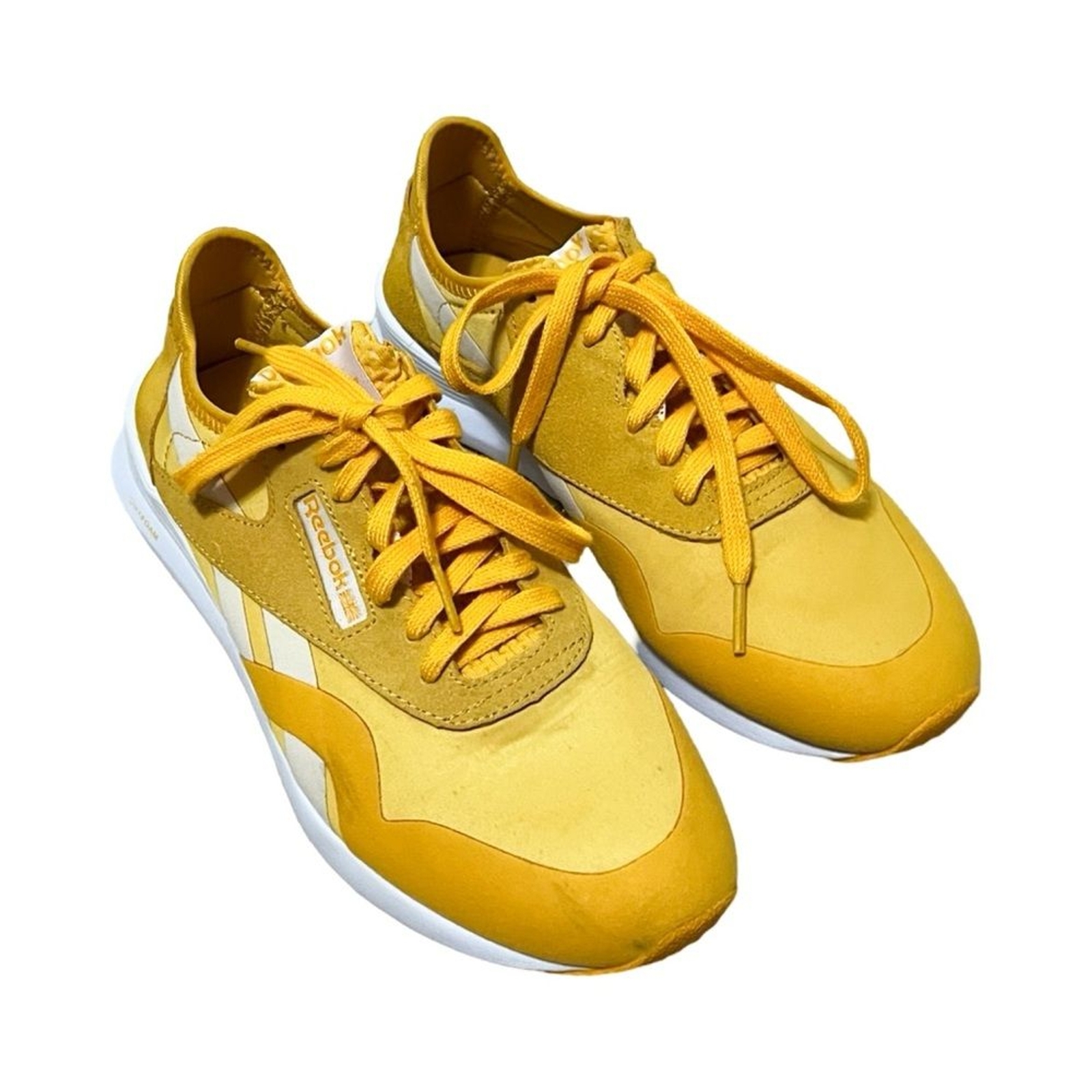 REEBOK Classic Nylon Women's Sneaker in Fierce Gold Sz 8.5 Pre-owned in excellent condition. No visible flaws. Best for: Athleisure, heritage style, and everyday wear Materials: Semi-stretch nylon, noeprene tongue, and suede overlay Removable EVA sockliner accommodates orthotics Low-cut design for mobility and freedom of motion Durable high-abrasion rubber outsole Does not include the box.