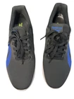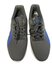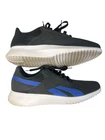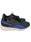 Reebok fluxlite men's size 10 black shoe with blue stripes lightly worn. There are wear marks on the bottom. The top of the shoe is in excellent condition. Like new condition
