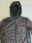 The Reebok Men's Hybrid Softshell Fleece Hooded Jacket in Black is a versatile and stylish outerwear piece perfect for casual occasions. Made with polyester outer shell material and featuring a softshell fabric type, this jacket offers both comfort and protection. The full zip closure, stand-up collar, and hood make it convenient for layering in various seasons. With accents like zippers and logos, this jacket also includes elastic waist, pockets, and a stretch fit for added functionality. The mid-length design and long sleeves make it a practical choice for activities like walking, cycling, or running. Pre-owned Excellent Condition Logo on the left side of chest is completely gone.