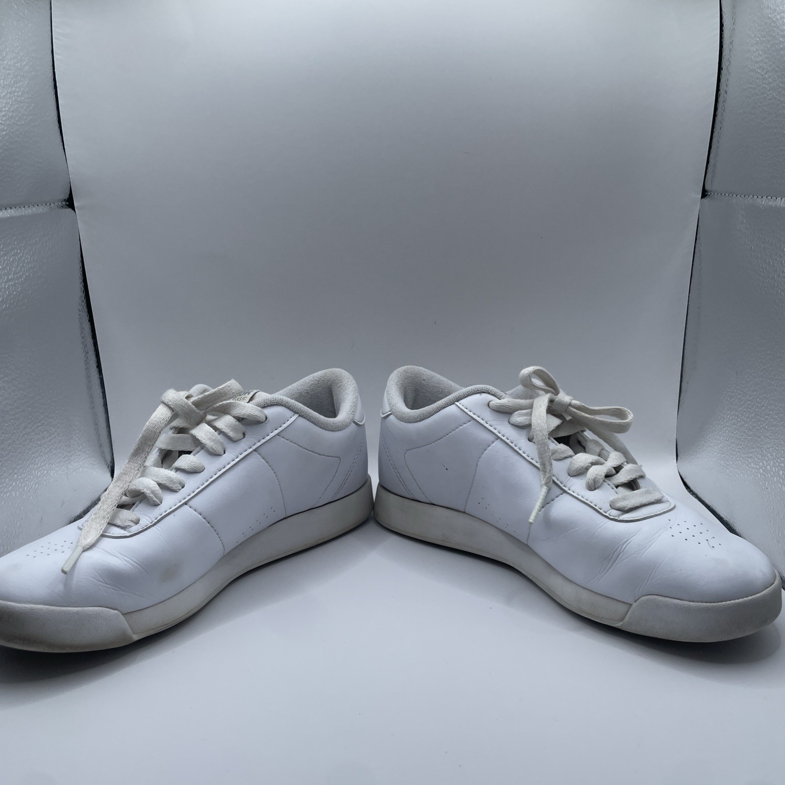 The Reebok Princess Women's Shoes in size US 5.5 are a stylish and comfortable pair of athletic sneakers. Featuring a low top shaft style with a lace-up closure, these white shoes are made with leather uppers and a foam insole for a premium feel. The rubber outsole provides durability and traction, making them ideal for various athletic activities. Made by Reebok, a trusted brand known for quality footwear, these shoes are a solid choice for women looking for both style and performance in their footwear.