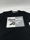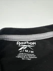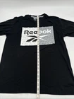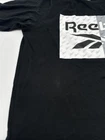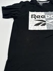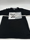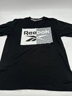 This is a Reebok T-Shirt for men in size M, featuring a black color with a graphic print logo on the front. It has a crew neck, short sleeves, and is made of polyester and cotton. The shirt has a regular fit and is easy to care for. It is a classic style tee from Reebok. Made in Pakistan. *Check the images above for the flaws and measurements of their item.