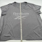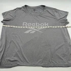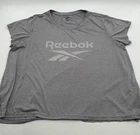 This women's Reebok T-Shirt in size 2X is a gray solid color with a graphic print logo. It features a round neck, short sleeves, and a casual fit, perfect for casual or workwear occasions. Made of polyester, this athletic style shirt has a classic and sporty theme, suitable for summer, fall, and spring seasons. Check pictures for flaws and measurements