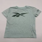 This is a Reebok T-shirt for youth girls in size 4, featuring a green color with a graphic print logo. It has a crew neck, short sleeves, and a relaxed fit. Made from a blend of polyester and cotton, the T-shirt is designed for casual wear and suits all seasons. Perfect for activities like walking or the beach, this top offers comfort and style with a sports theme. Check pictures for flaws and measurements