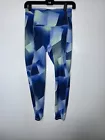 These are Reebok Women's Printed Evolution Mid Rise Leggings in size Small, featuring a blue geometric pattern. Made from a polyester blend fabric, these compression leggings have a 24-inch inseam and a 26-inch waist size. They are designed for activewear purposes such as CrossFit, yoga, and running, and include pockets for convenience. The leggings are part of the Reebok CrossFit product line, suitable for athleisure wear in summer, fall, and spring.