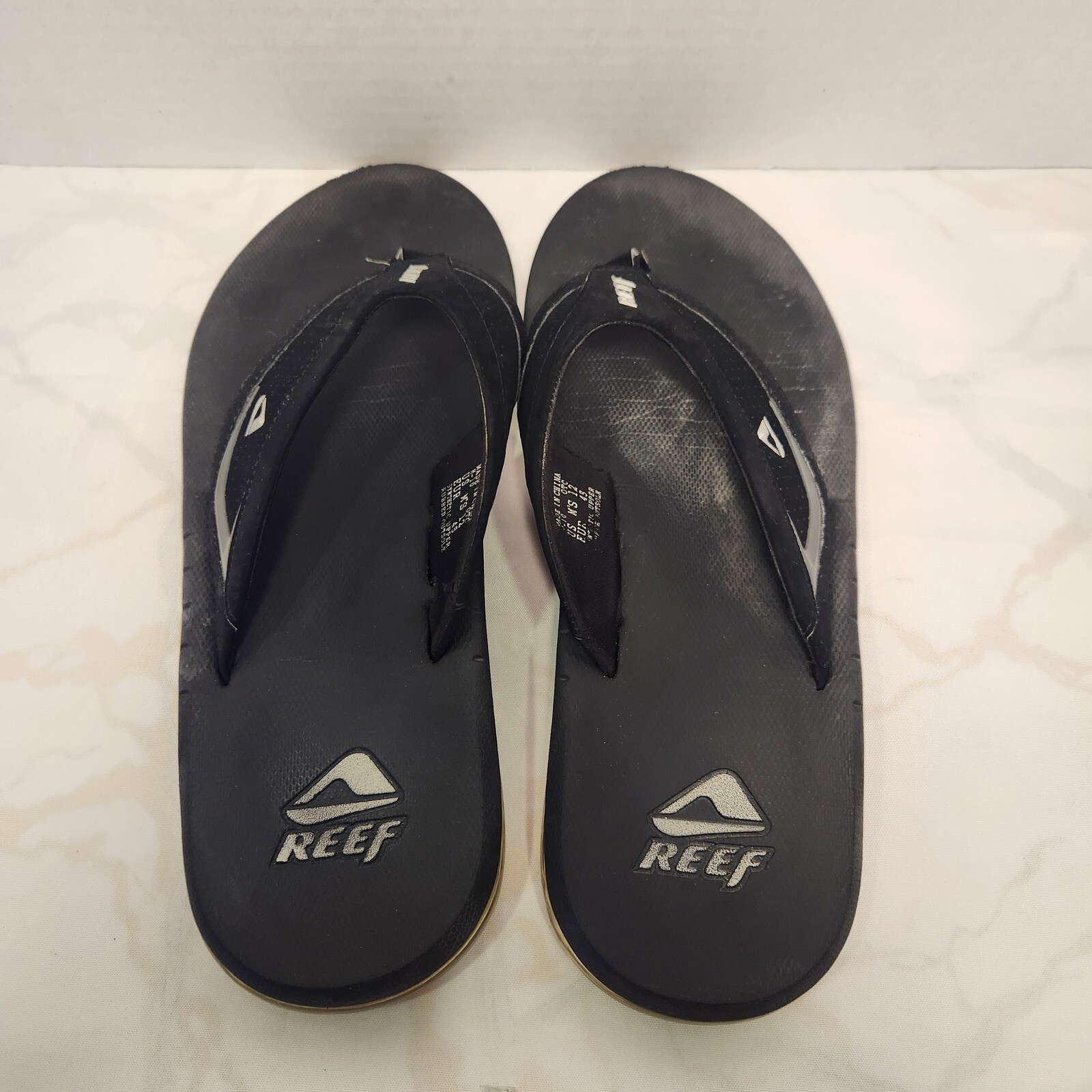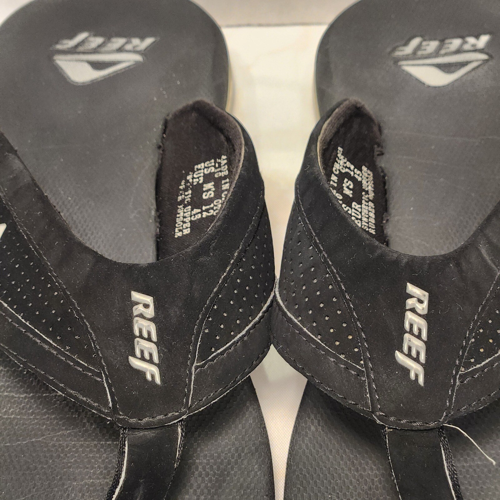 Pre-Owned, in good condition, see photos. Men's size 12, Reef, H-10 flip flop sandal. Black and silver, synthetic upper, rubber outsole. Stored in a smoke-free and pet friendly environment. All orders ship within two business days, combine orders for discount on shipping. Reasonable offers accepted. Thanks for looking!