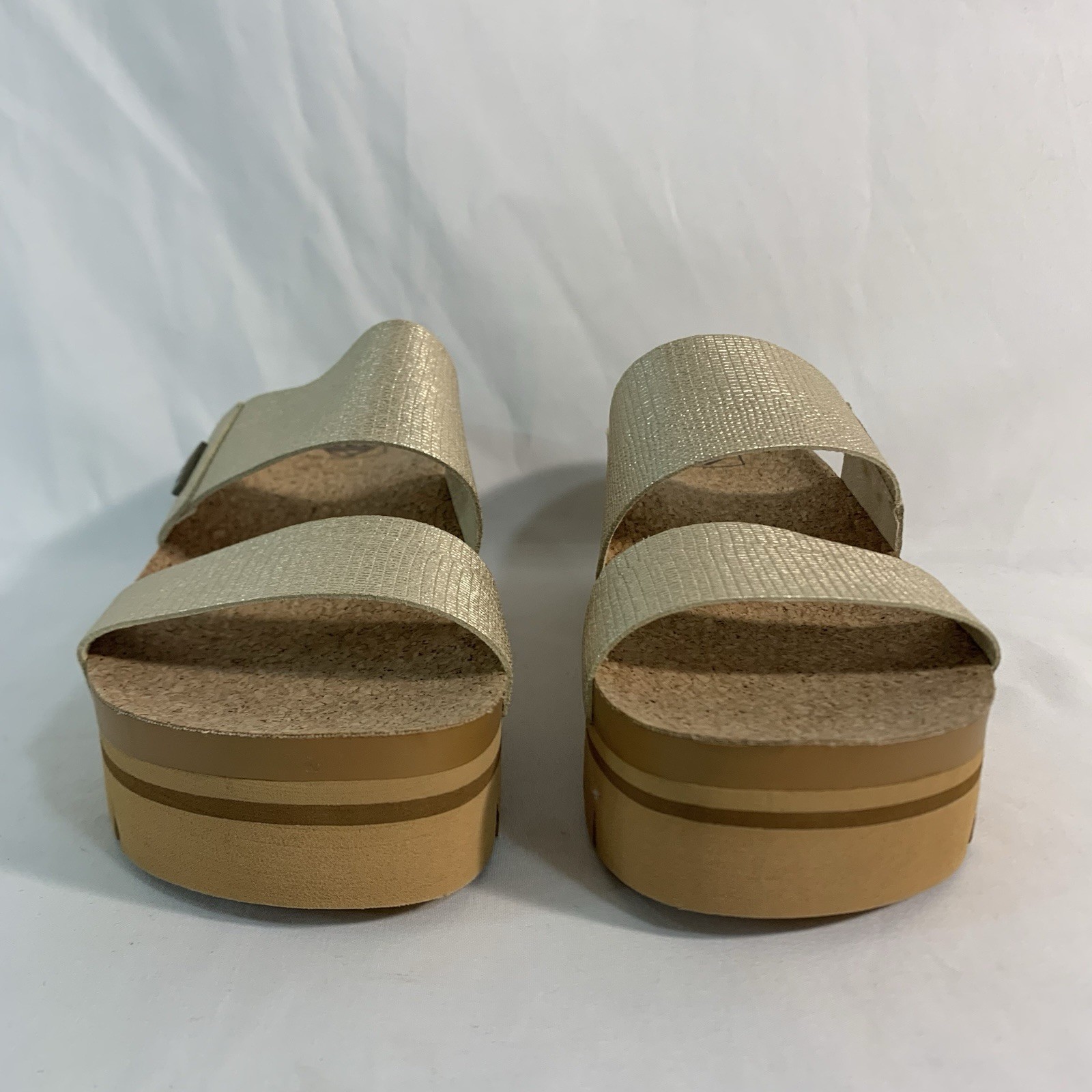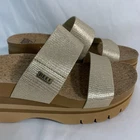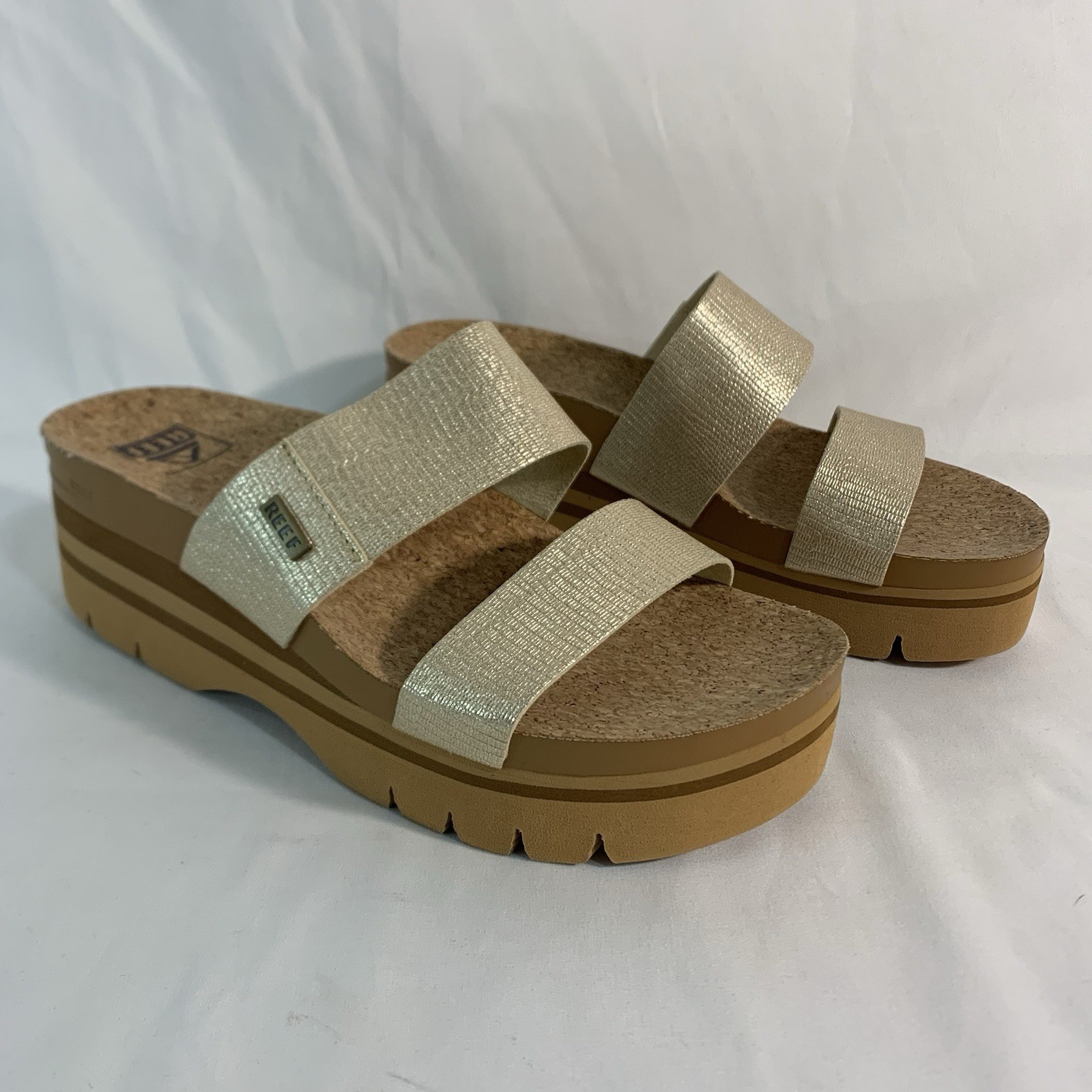 The Reef Women’s Cushion Vista High Slide Sandal is a comfortable platform sandal in a stylish gold color, perfect for various occasions. With a slip-on closure and a mid heel height, it offers both convenience and stability. The sandal features cushioning and arch support for added comfort, as well as being breathable and made with synthetic materials. Ideal for outdoor and nature-themed settings, these sandals are a great choice for summer, fall, and spring. See photos for details, condition and measurements. Great, like new condition!