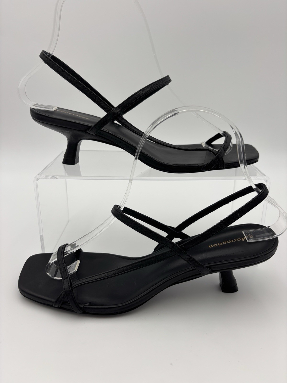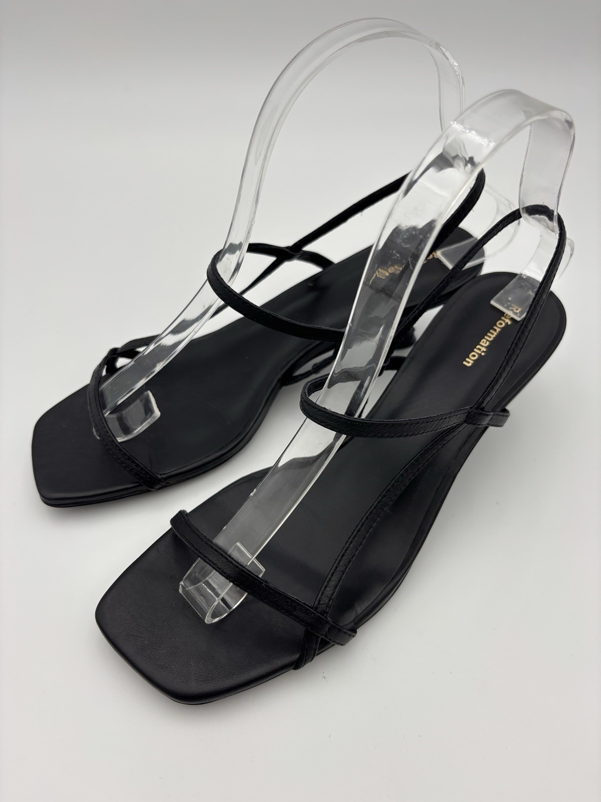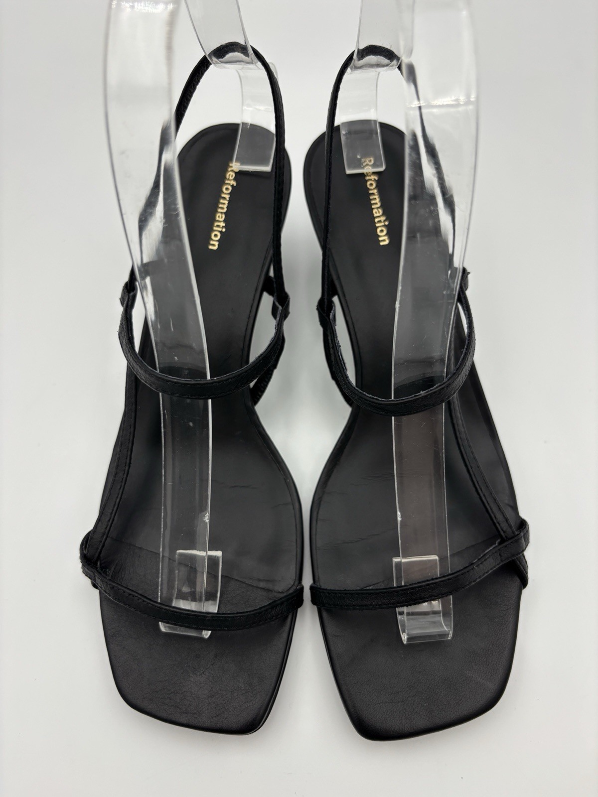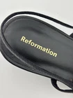 Reformation Serenity Bare Leather Slingback Sandals — Black leather, Strappy, Women's US 7 See photos for condition - great conditon, regular wear on outsoles Size 7, heel height 2", footbed length 9 9/16" Stylish, minimalist strappy sandals from Reformation with a timeless slingback silhouette. Clean black leather upper and a low 2" heel make these versatile for day-to-night wear — perfect for summer events, weddings, or everyday dressing. - Brand: Reformation — Serenity Bare Leather Slingback Sandals - Size: US 7 - Heel height: 2" (approx. 5.08 cm) - Footbed length: 9 9/16" (9.5625" ≈ 24.3 cm) - Color: Black leather - Material: Leather upper and footbed - Style: Strappy, open-toe slingback — elegant and minimal - Condition: Great condition — regular wear on outsoles. See photos for details and close-up views.