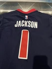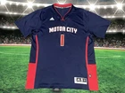 Show your love for the Detroit Pistons with this Reggie Jackson #1 Motor City Adidas Swingman Jersey. Made for basketball fans, this original and authentic jersey is perfect for anyone who wants to support their favorite team. The jersey features the Adidas logo, as well as the Detroit Pistons emblem, making it a must-have for any true fan. This jersey is size XL and has been previously worn, adding character and style to your wardrobe. It's perfect for game day or everyday wear, and is sure to make a statement wherever you go. Get your hands on this unique piece of fan apparel and show your love for the Pistons today!