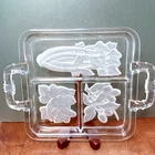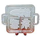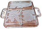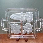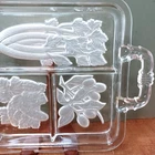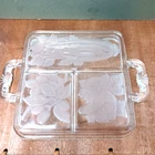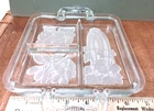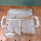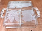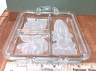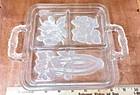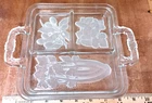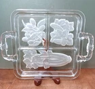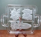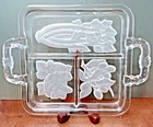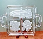 This vintage serving tray from Indiana Glass is a stunning piece of Art Deco style. The rectangular shape with frosted clear Intaglio vegetables pattern gives it a unique touch. The tray measures 10 inches by 6.5 inches and is perfect for serving relish or other snacks at your next dinner party. Don't miss out on the chance to own a piece of history with this beautiful and rare serving tray.