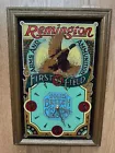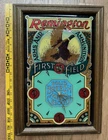 Vintage Remington Arms & Ammunition First in the Field Holifoil Glass Wall Clock with Oak Frame. Fully operational. Hubby installed new movement, but we will include original hands and mechanism in an envelope taped to the back. Approximately 19" x 13" x 2”. Excellent condition. No chips or cracks. Ready to be hung immediately. Perfect for a bar, den, man cave, cabin, hunting or fishing lodge. Excellent gift for the sportsman. Ships from the Midwest.