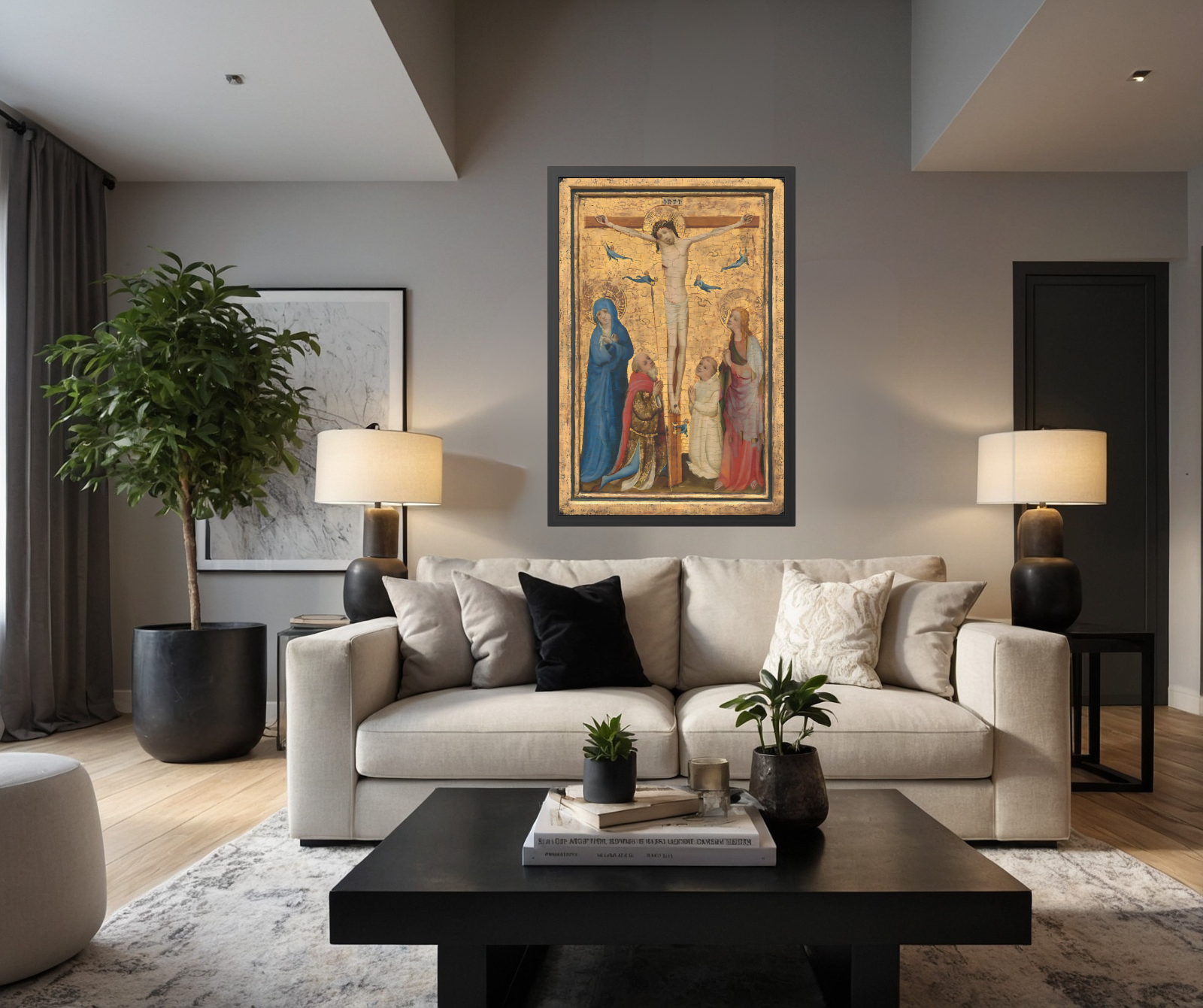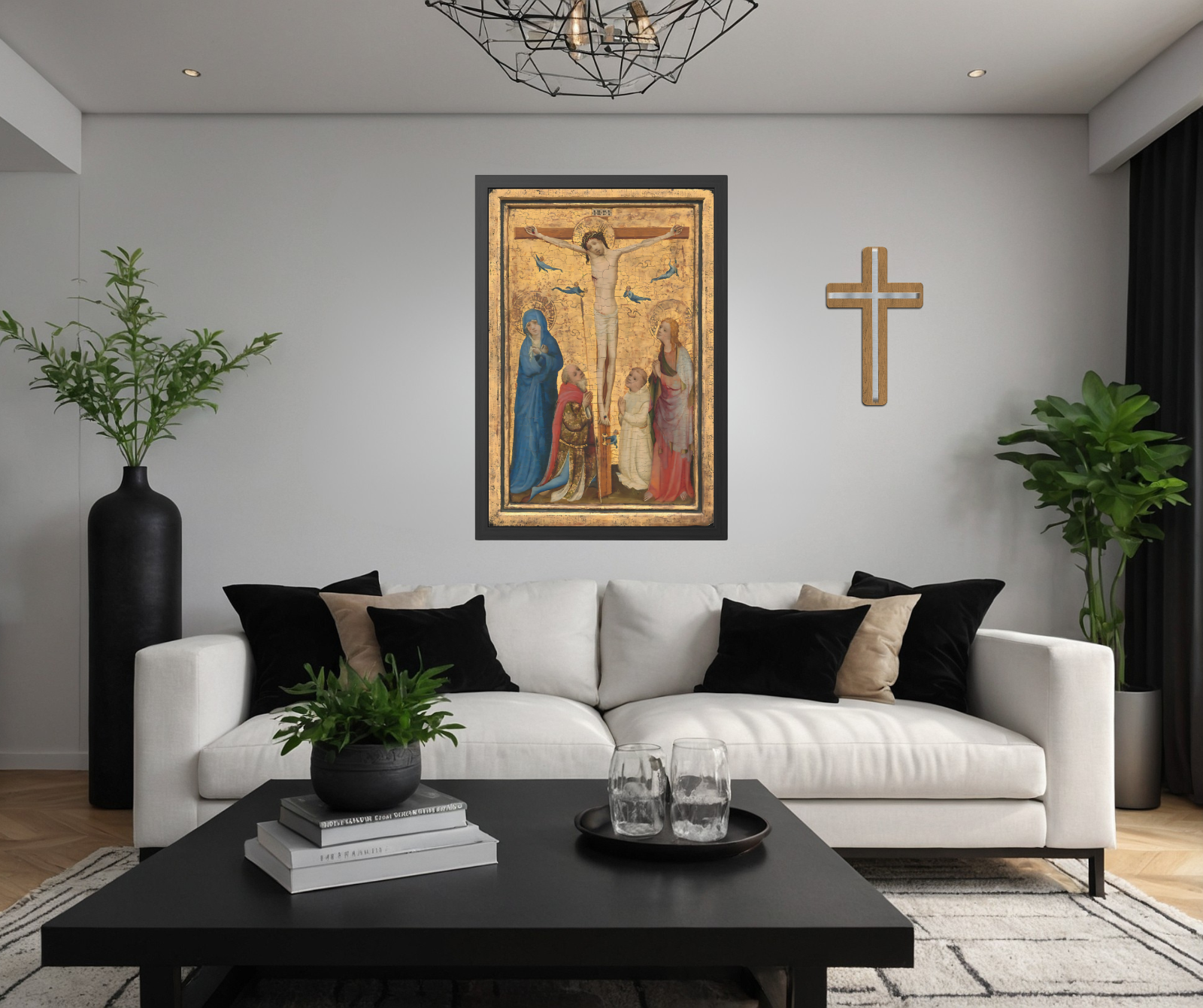 "The Crucifixion" – Renaissance Reproduction Product Description: Step back in time to the profound artistry of the 15th century with " The Crucifixion " by the Master of Saint Veronica. This Renaissance masterpiece captures the emotional depth of Christ nailed to the cross, surrounded by four figures at its base. The symbolic vertical composition reflects themes of Christianity and divine sacrifice, making it a timeless piece for art enthusiasts and those seeking inspiration through biblical artistry. Hypnotik Creations has meticulously reproduced this public domain artwork, ensuring that every detail of the original is preserved with exceptional clarity. Printed in HDR on premium 200 gsm semi-gloss photo paper , this reproduction showcases vivid colors and fine textures that bring the masterpiece to life. The state-of-the-art Mimaki UV Inks provide unparalleled brightness and durability, ensuring the print retains its brilliance for years. Encased in a hand-crafted black wooden frame , the design features a semi-wide, smooth finish that enhances the artwork's elegance while providing sturdy support. The clear Perspex (Plexiglas) insert cover is scratch- and shatterproof, offering superior protection without compromising visual clarity. Made in the USA from eco-friendly materials , including globally sourced and recycled components, this framed print reflects a commitment to sustainability. Delivered ready to hang , the framed artwork includes an enclosed back and a hanging kit for effortless installation. Each piece is custom-made after purchase, guaranteeing the newest condition for your display. Whether for a sacred space, study, or living area, " The Crucifixion " invites reflection and awe into any environment. Key Features: Timeless Renaissance Art: Features Christ on the cross surrounded by four symbolic figures, a profound biblical and symbolic depiction from the early 15th century. HDR Printing: Vivid, crisp colors printed on 200 gsm semi-gloss photo paper with advanced Mimaki UV Inks for a professional finish and lasting quality. Premium Frame: Hand-crafted black wooden frame with a semi-wide, smooth finish, paired with a scratch- and shatterproof Perspex (Plexiglas) cover. Eco-Friendly Materials: Made in the USA using globally sourced and recycled components, reflecting sustainable craftsmanship. Ready to Hang: Includes an enclosed back and a hanging kit, ensuring easy installation right out of the box. Durable and Easy to Maintain: Dust off gently with a clean, dry cloth to keep the artwork pristine. Made to Order: Custom-printed and framed after purchase, guaranteeing the newest condition for your display. Perfect For: Adding a touch of Renaissance elegance to sacred spaces, living rooms, or offices. Art collectors seeking meaningful biblical-themed masterpieces. Gifting to those who appreciate the beauty and symbolism of Christian art. Enhance your home or sacred space with the timeless beauty of " The Crucifixion " . Order now and bring the profound artistry of the Renaissance into your world with this expertly crafted reproduction! 4o