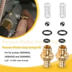 Feature 【Compatible】 Pressure Washer Soap Syringe Kit is compatible with pumps 190593GS, 190635GS and 203640GS. (1/8'' -27 BSP male thread) 【Replacement method】 Remove the old fuel injector with a wrench. Remove any sticky or dry soap from the container. Make sure the rubber o-ring is on the injector as shown. Put the ball bearing in the injector, and then use the spring on the small end of the spring against the ball bearing. Insert the injector into the socket and use a 13mm wrench to tighten the injector. Do not overtighten or it will damage the o-rings or crack the white metal on the pump. 【Function】 If parts on your high pressure washer pump are worn, rusted, or clogged with hard water deposits, you can replace it with this set. This will make your high pressure washer pump smoother to use. 【Package contains】 2 chemical syringe kits including 2 brass barbs, 2 check valve balls, 2 springs, 2 O-rings. 【Satisfaction Guarantee】 Provides a 100% satisfied after-sales service. If you are not satisfied with it, simply return it within 30 days for a full refund. Premium Support 1 year Warranty. Pacakage Inclued 1*Pressure Washer Chemical Soap Injector Kit