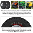 15 X 6.00 - 6 TIRE AND WHEEL SET SUITABLE FOR LAWN TRACTORS WITH 14.2" WHEELS WITH 3/4" Sintered iron bushings - Are you still searching for separate wheel rims, tires, and inner tubes for your lawn mower. Why not try this pre-assembled set? High-quality and durable, these tire and wheel assemblies will fit most lawn mowers that tires with an outer diameter of around 14.2 inches, and a section width of 5.3 inches. For a perfect fit, the existing wheel should have 3/4-inch diameter Sintered iron bushings, and a hub that is about 3 inches long. HIGH-QUALITY AND HIGH LOAD CAPACITY 15X6.00-6 NHS LAWN MOWER TIRES AND WHEELS - The tires are made of high-quality all-season rubber that are both dependable and durable. These tires are 4 ply with a maximum psi of 30 and a maximum load capacity of 570 pounds. PERFECT FOR GARDEN, LAWN, AND TURF - The tires' non-directional chevron-designed tread provides maximum grip and traction even on challenging terrain. The addition of non-grease precision ball bearings provides an assurance of a smooth ride on any terrain. And the best part? The treads' design prevents it from damaging turf and accumulating dirt. We also offer 40-day free return so you can shop with a peace mind. Exact 15X6.00-6" Front Tire Replacement: Compatible with Craftsman, Husqvarna, and John Deere riding mowers, as well as many lawn tractors and garden tractors using 15x6.00-6 front tires. A dependable OEM-style replacement for smooth lawn operation. Complete Pneumatic Tire & Wheel Set: Includes 15x6.00-6 pneumatic tire and wheel with a 14.2" overall diameter, 5.23" width, and 6" rim size. Built for front installation with a 3" centered hub and 3/4" oil-infused bushings for easy replacement. Heavy-Duty 4-Ply Construction: Made from premium natural rubber with reinforced 4-ply strength. Each wheel supports up to 400 lbs at 30 PSI, providing excellent impact resistance, stability, and long-lasting reliability on tough terrain. Turf-Friendly Tire Tread: Features a turf friendly tread pattern for smooth rolling and reduced turf damage. Ensures great traction and maneuverability on grass, gravel, or sandy areas—ideal for residential or commercial mowing. Non-Highway Use & Fit Confirmation: These pneumatic lawn mower tires are NHS-rated (Not for Highway Service). Please confirm your original tire size and specifications before purchase to ensure a perfect fit and safe performance.
