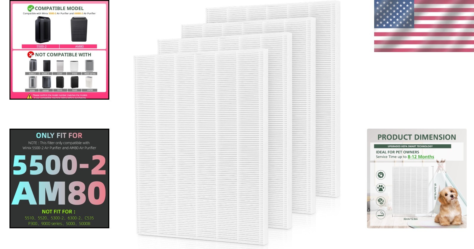 Replacement HEPA Filters for Winix 5500-2 & AM80, Pack of 4 - Odor Reduction ‹ › ‹ › ‹ › ‹ › ‹ › ‹ › ‹ › ‹ › ‹ › Replacement HEPA Filters for Winix 5500-2 & AM80 - Pack of 4 Experience the perfect solution for superior air quality with our high-performance replacement HEPA filters, specifically designed for the Winix 5500-2 and AM80 air purifiers. Features: Perfect Compatibility: Engineered as a replacement for Winix 5500-2 Air Purifier and Winix AM80, ensuring a flawless fit. Note: Confirm your air purifier model number before purchase. Superior Performance: Featuring an advanced 99.97% HEPA filter that optimizes your air purifier’s efficiency and enhances indoor air quality. 4 Pack HEPA Filters: Each set includes four high-quality filters constructed with HEPA 13 technology to maximize filtration efficiency. Environmentally Friendly: Crafted from non-woven fabric with a focus on lower energy consumption and reduced structural density, ensuring high efficiency. Pet Friendly: Designed specifically for households with pets, targeting pollen, dander, and odors, effectively filtering 99.97% of airborne particles larger than 0.3 microns. Commitment to Quality: Our filters are made of FSC-Certified paper, ensuring responsible sourcing and environmental consideration. Benefits: Creates a healthier living environment by significantly reducing airborne pollutants. Ideal for pet owners looking to maintain clean and fresh air. Improves efficiency of air purifiers leading to energy savings and lower operational costs. Easy installation ensures hassle-free usage for maintaining pristine air quality. Why Choose Our Replacement HEPA Filters? Transform your indoor air quality and ensure the health of your family and pets with our Replacement HEPA Filters. By effectively capturing airborne particles and reducing odors, you create a sanctuary of clean air. Our commitment to quality, environmental responsibility, and customer satisfaction guarantees that your purchase meets your needs for a healthier home. Ensure you breathe the purest air possible – order your pack of 4 HEPA filters today! Shipping Free & Fast Shipping - We offer free shipping to most of the USA with a normal delivery time of 3-7 days. However, due to the current situation, additional delivery time (up to 3 weeks) may be required for some items. Alternative Carriers - We may use alternative carriers (e.g. USPS, FedEx, UPS, etc.) to ensure your package arrives safely and on time. Due to the use of multiple carriers, we are unable to provide a tracking number automatically. Handling Time - Orders are processed and shipped within 1-2 business days of receiving cleared payment. Shipping Restrictions - Shipping to Alaska, Hawaii, Puerto Rico, Guam, and other US territories may incur shipping charges or delivery restrictions. Please contact us before ordering, or your order can be refunded/cancelled. State Restrictions - There may be restrictions based on your state of purchase. For example, certain items may not be shipped to California due to state regulations. Contact for Tracking Updates - If you require tracking updates or have any concerns about the delivery of your order, please feel free to contact us, and we will be happy to assist you. Return 30-Day Hassle-Free Returns - We want you to be completely satisfied with your purchase. If you are not, you can return the item within 30 days of receiving it for a full refund or exchange. Easy Return Process - To start a return, simply contact us and we will provide you with a prepaid return shipping label and detailed instructions. Restocking Fee - There are no restocking fees for returns. However, the buyer is responsible for return shipping costs if the return is not due to a seller's error. Refund Processing Time - Refunds will be processed within 5 business days of receiving the returned item in its condition. Payment We accept all major credit cards, PayPal, and Apple Pay for your convenience. Your payment information is secure and encrypted to ensure a safe and seamless transaction. Please complete your payment within 3 days of purchase to avoid any delays in shipping. Feedback Your feedback is extremely important to us. We strive to provide the best products and customer service possible. If you are satisfied with your purchase, please take a moment to leave us a positive review. If you have any concerns or issues with your order, please contact us before leaving negative feedback. We are committed to resolving any problems and ensuring your satisfaction. Contact Us If you have any questions or concerns, please feel free to out to our customer support team. You can contact us through the eBay messaging system. We are available Monday to Friday, 9:00 am to 5:00 pm EST, and we will do our best to respond to your inquiry within 24 hours. Buy it now and enjoy a pleasant shopping experience! Unit Quantity: 4.0 count Application: Air Purifier Filter Frame Material: Paper Features: Dust Resistant,Reusable/Washable Filter,Odor Resistant,Pet Friendly Smart Home Protocol: Not Applicable/Not Available Smart Home Compatibility: Not Applicable/Not Available Type: Cartridge MERV Rating: 17 Number in Pack: 4 Filter Media: Non-woven Fabric Filtration Technology: HEPA Color: White Item Height: 0.98 in