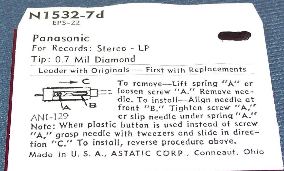 Phonograph needle, Astatic N1532-7d, replaces Panasonic EPS-22. Used in: CS-1025M. Tip: .7 mil diamond. Speeds: 16, 33 & 45 RPM. New old stock. 692-D7 Search my store titles AND descriptions. Enter your needle no., cartridge no., or brand name. E-mail for further help. IF YOU ARE PURCHASING A NEEDLE Model numbers are provided in manufacturer's references for the cartridge they installed in those models. If the cartridge has been changed by a dealer or user, this needle will not be correct for the model numbers listed, as it is the cartridge that determines what needle is needed. Be sure it looks like your old needle.