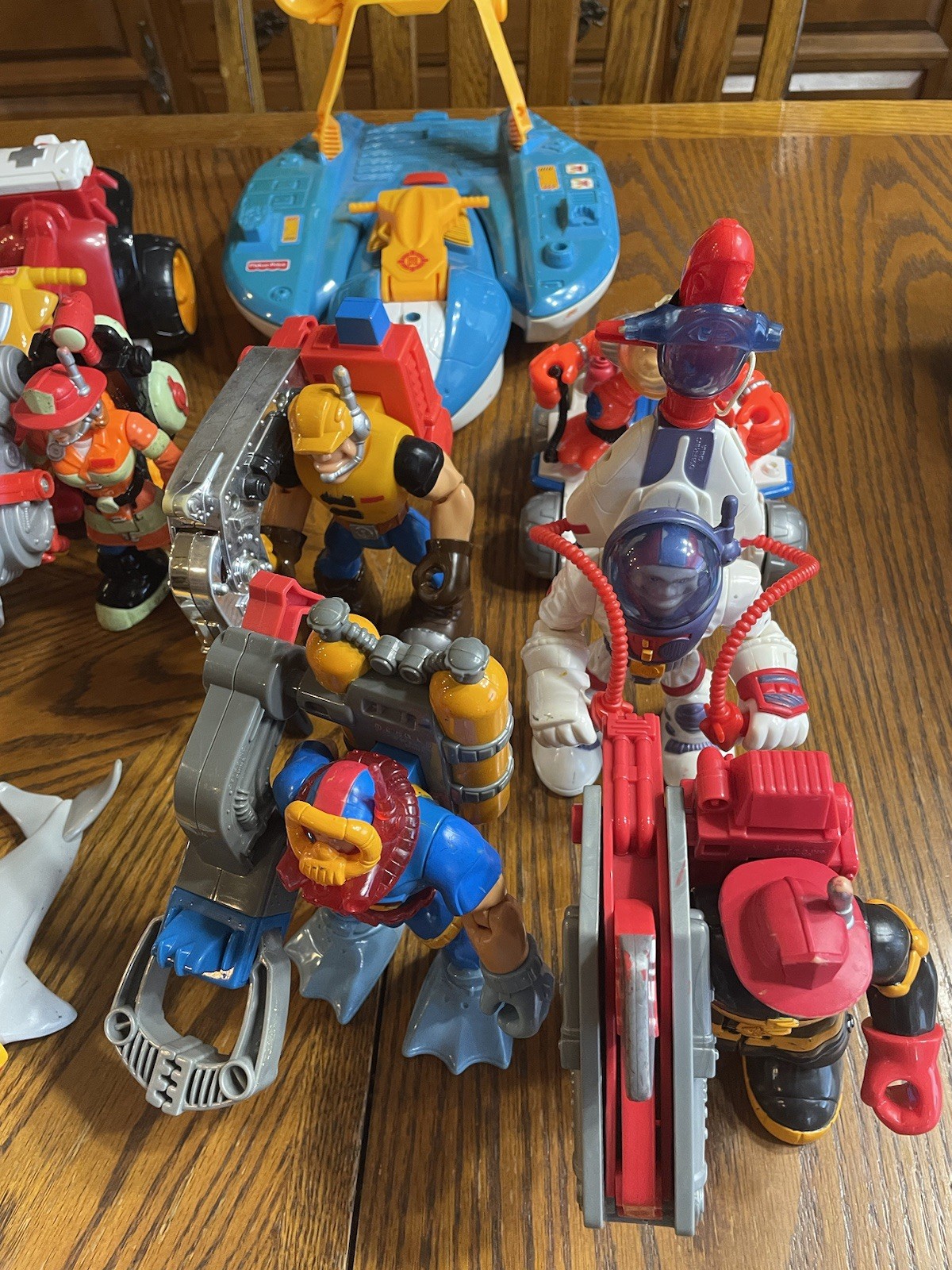 The Rescue Heroes Mixed Lot of Figures, Vehicles, and Animals is a collection of toys from the Fisher-Price brand, suitable for children aged 4-7. Included in this set are various characters from the Rescue Heroes toy line; some are complete, others are not, and all are well-loved and shows signs of wear and tear.
